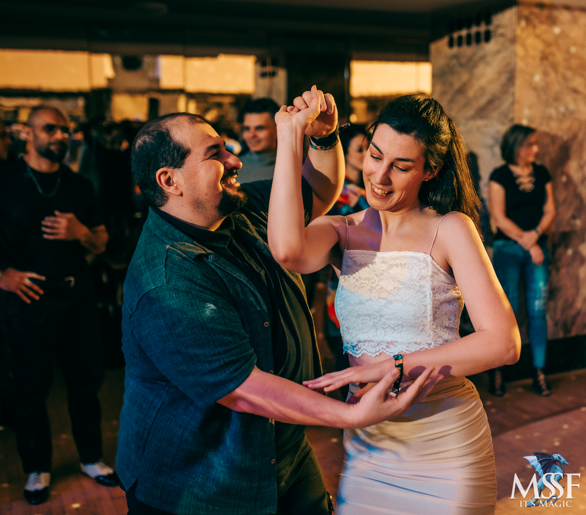 render a glam photo with man dressed in blue smoking lady silver with shiny glamur background
