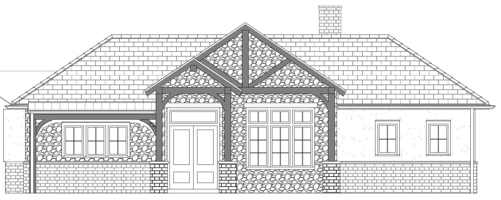 gray roof tan natural stone in center gable with cream trim copper standing seam roof at left side
