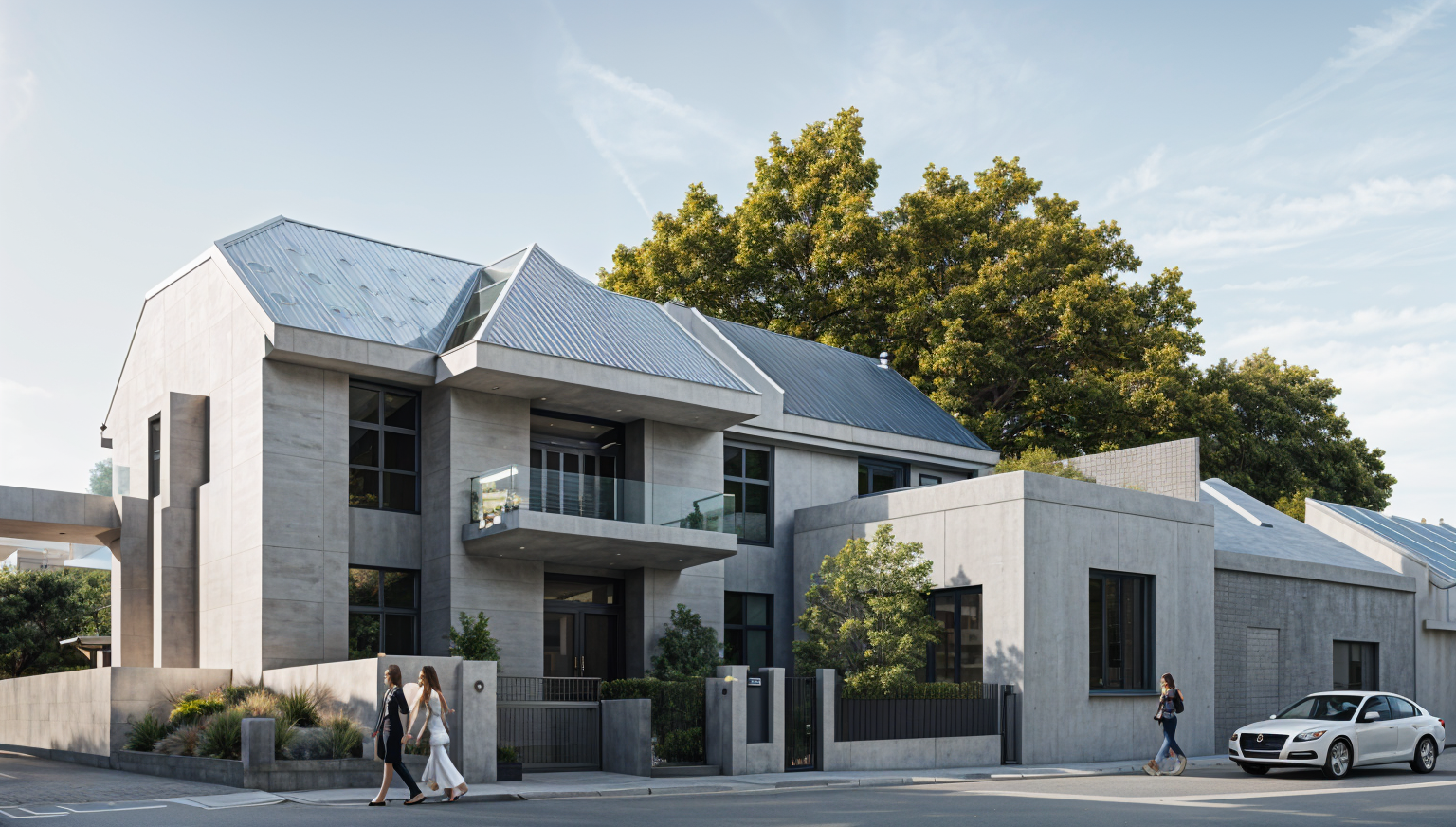 exterior shot the terrace on the left si with a plant wall desks and office chairs are on the left and center of the room couches on the right