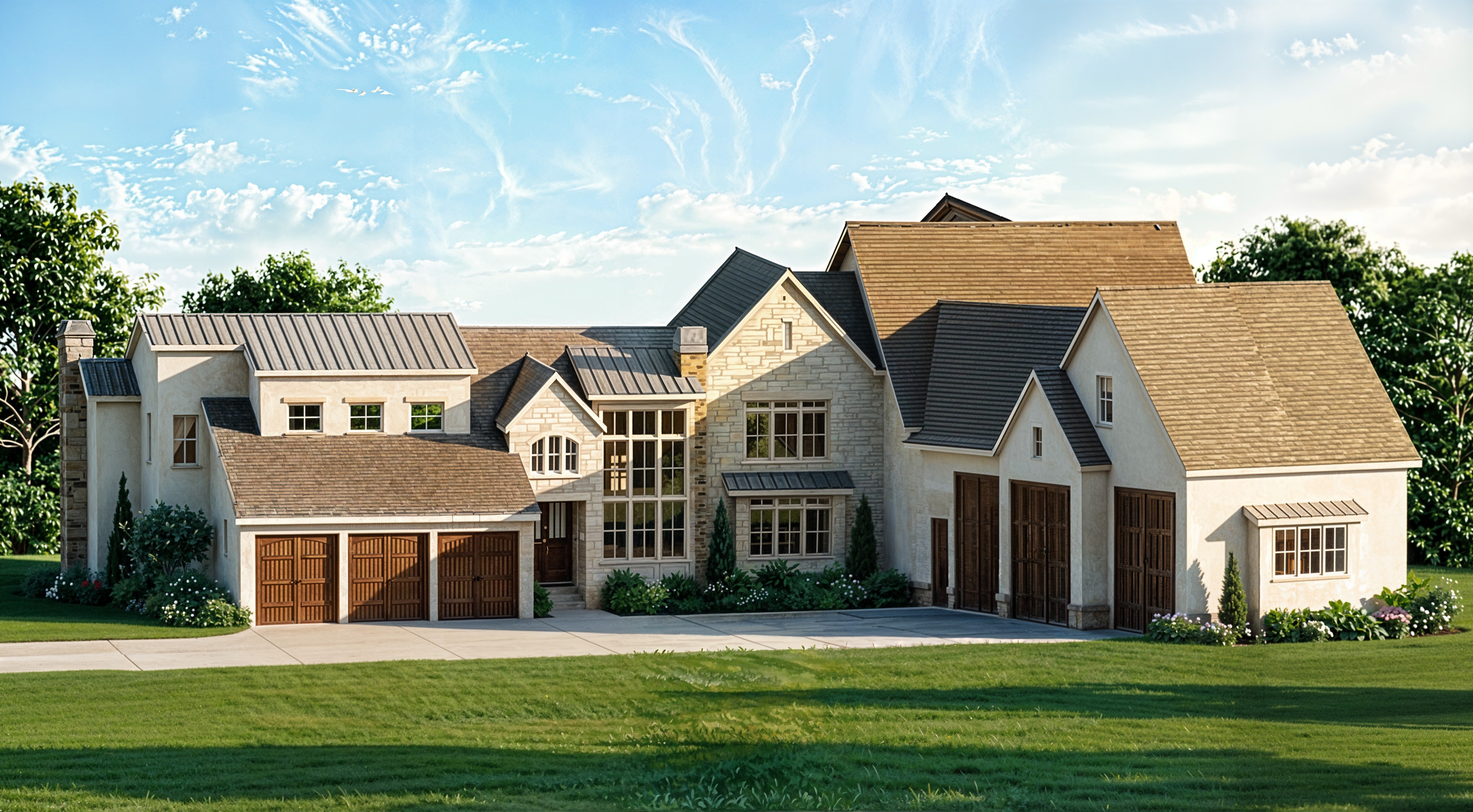 do not change the layout do not add or remove anything only do the following exaggerate the 30 degree angle between the middle of the home and the three car garage on the right side