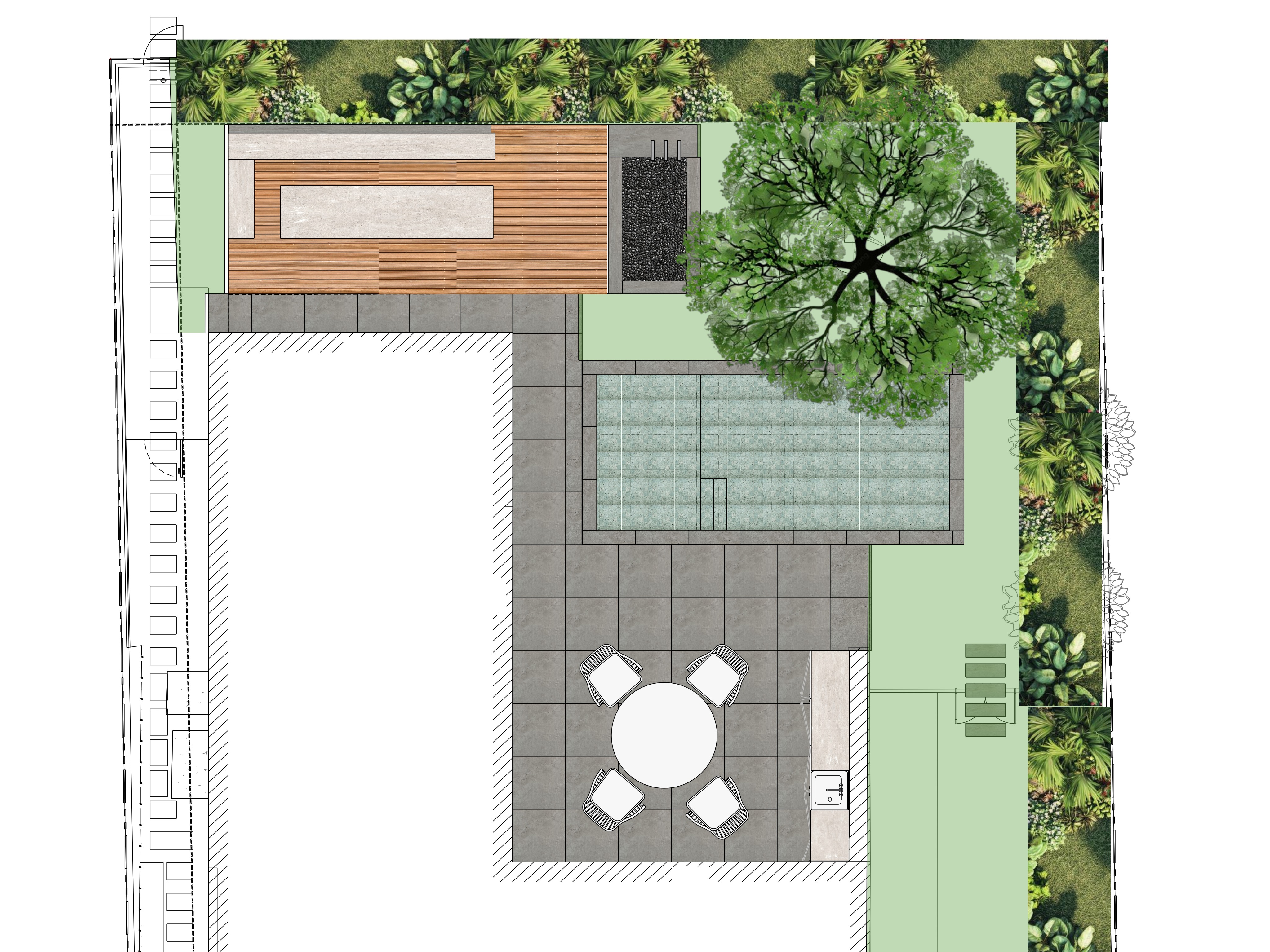 on the deck make the l shape a bench with seat cushions and make the center table a large coffee table with water in the center and the item next to the deck is a water feature and make the pool a sukabumi bali tile