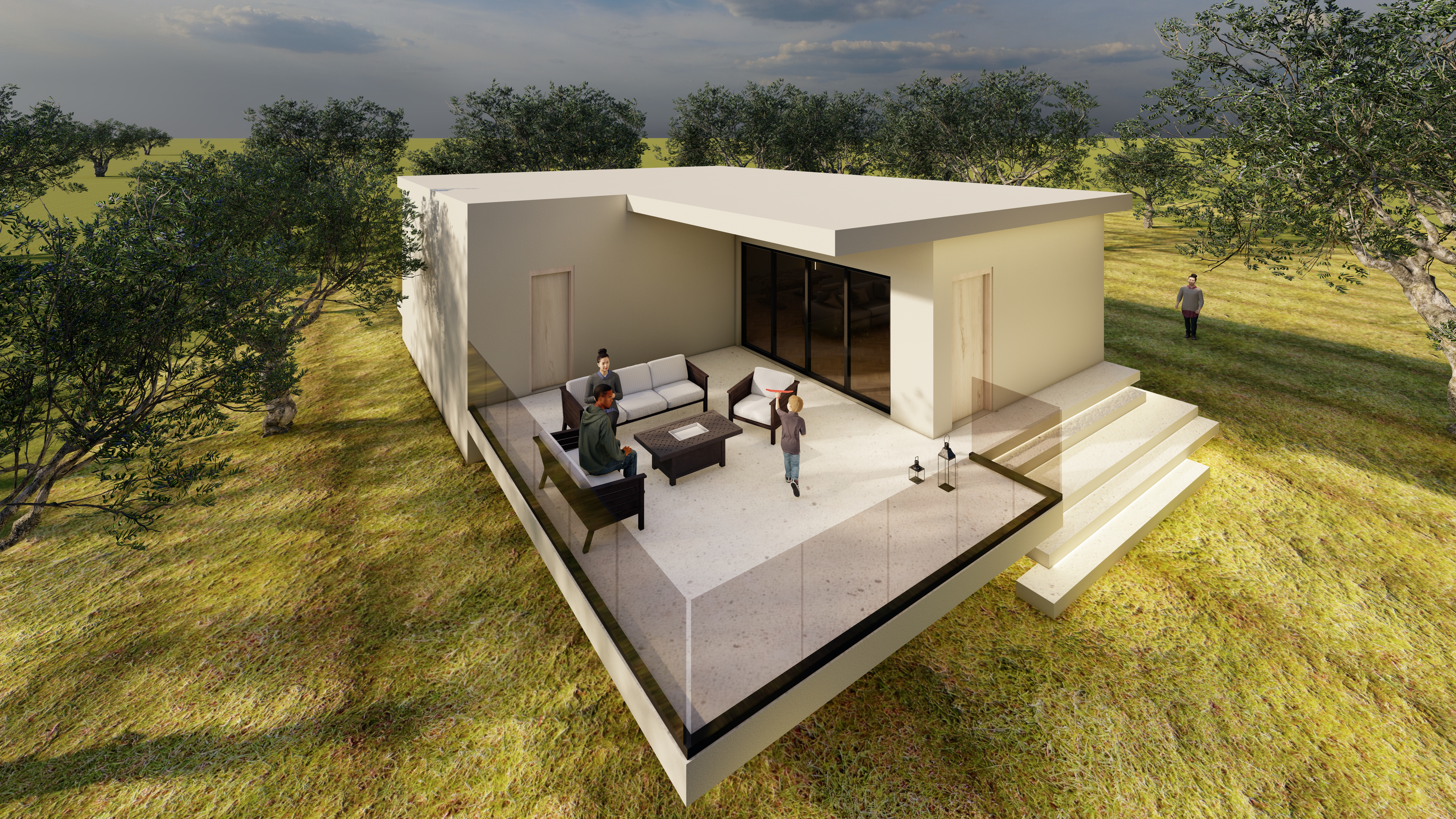 improve the photo add light under the steps of the stair add a wall light in the entrance wall and some more people the photo is perfect just change the light under the stairs i want to see it only in the front of it floor light delete the light that luminates the grass make the entrance door more like entrance door