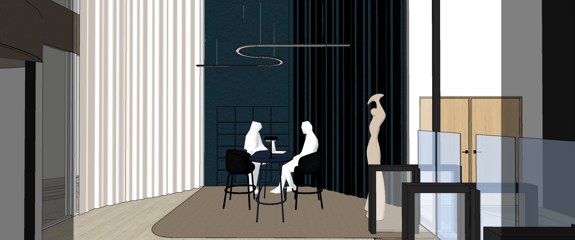 render a modern indoor seating area with a sophisticated atmosphere the walls are a deep navy blue complemented by linen beige curtains the flooring is a light beige tiles tone creating a warm foundation a sleek minimalist table and chairs set in matte black are centrally positioned enhancing the modern design behind the seating area flowing navy acoustic felt de vorm add depth and elegance a unique abstract sculpture in a smooth light beige texture stands gracefully to one side the ambient lighting is warm and subtle casting gentle shadows and highlighting the textures of the materials used the overall atmosphere is a blend of elegance and modern comfort