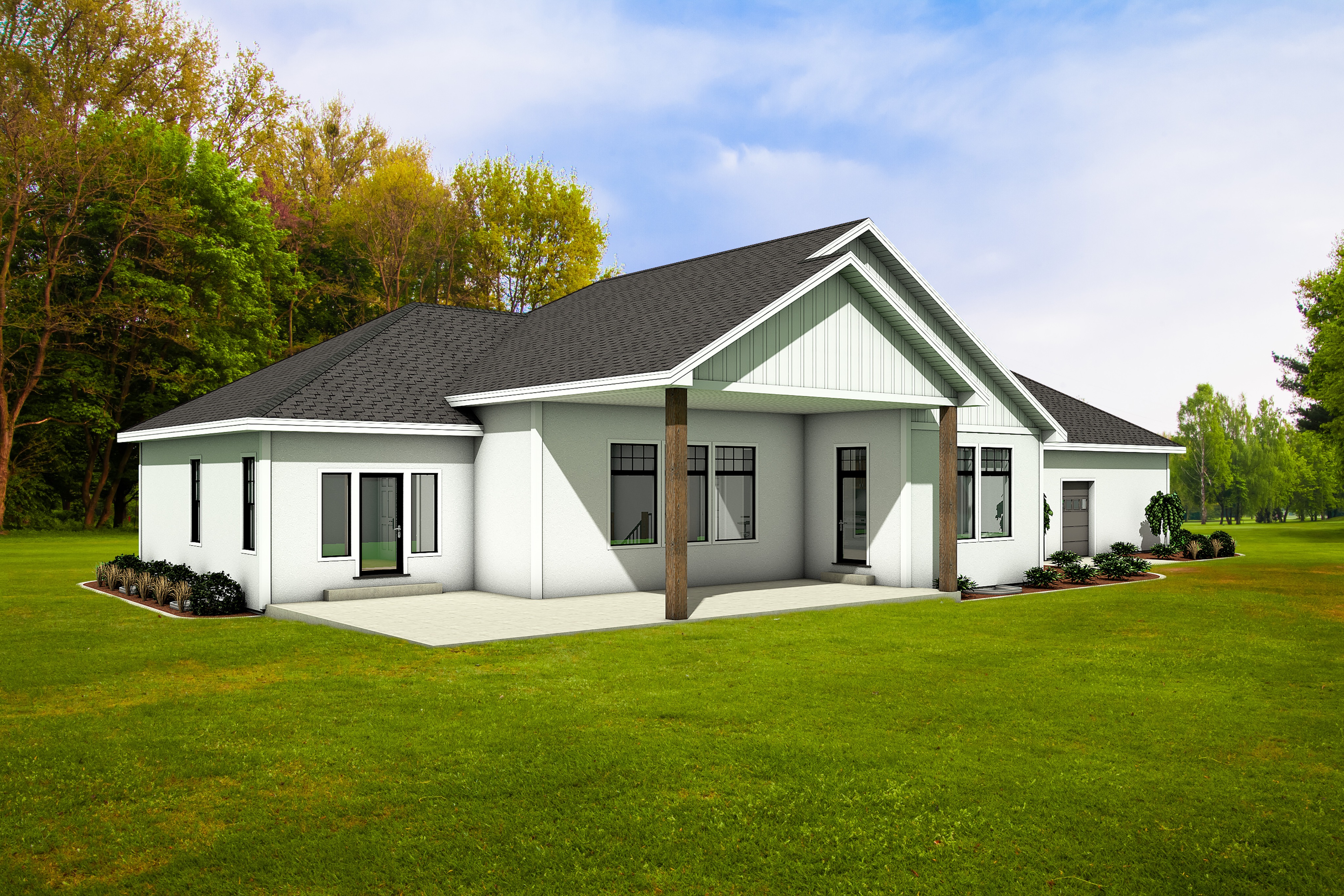 a modern house retain the exact structure colors and window arrangement rooflines siding foundation height and proportions exactly as shown in the reference image integrate into the terrain there is a lush dense forest of mixed hardwoods that are mostly on the sides of the image add cooler afternoon sunlight subtle dappled highlights across the siding and grass create ultra realistic lighting crisp shadows detailed textures in the siding and glass reflections and an overcast sky show only a few lights visible inside render in hyper realistic architectural visualization quality 8k resolution add a driveway tying into the concrete garage door apron make it the fall season add realistic landscape
