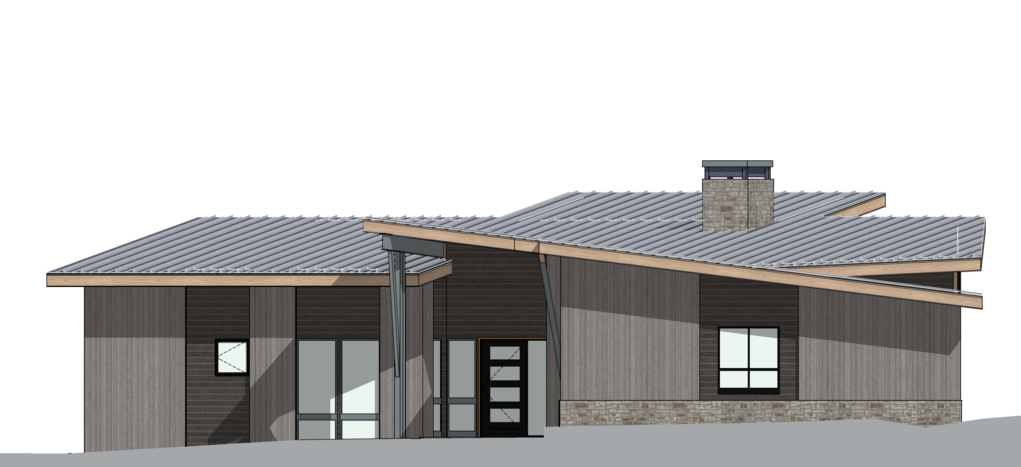 mountain modern ski home warm light emanating from the windows weathered brown vertical siding in grey areas and dark wood horizontal siding in black areas snowy pine forest around the home and distant low mountains alpine glow from behind the camera