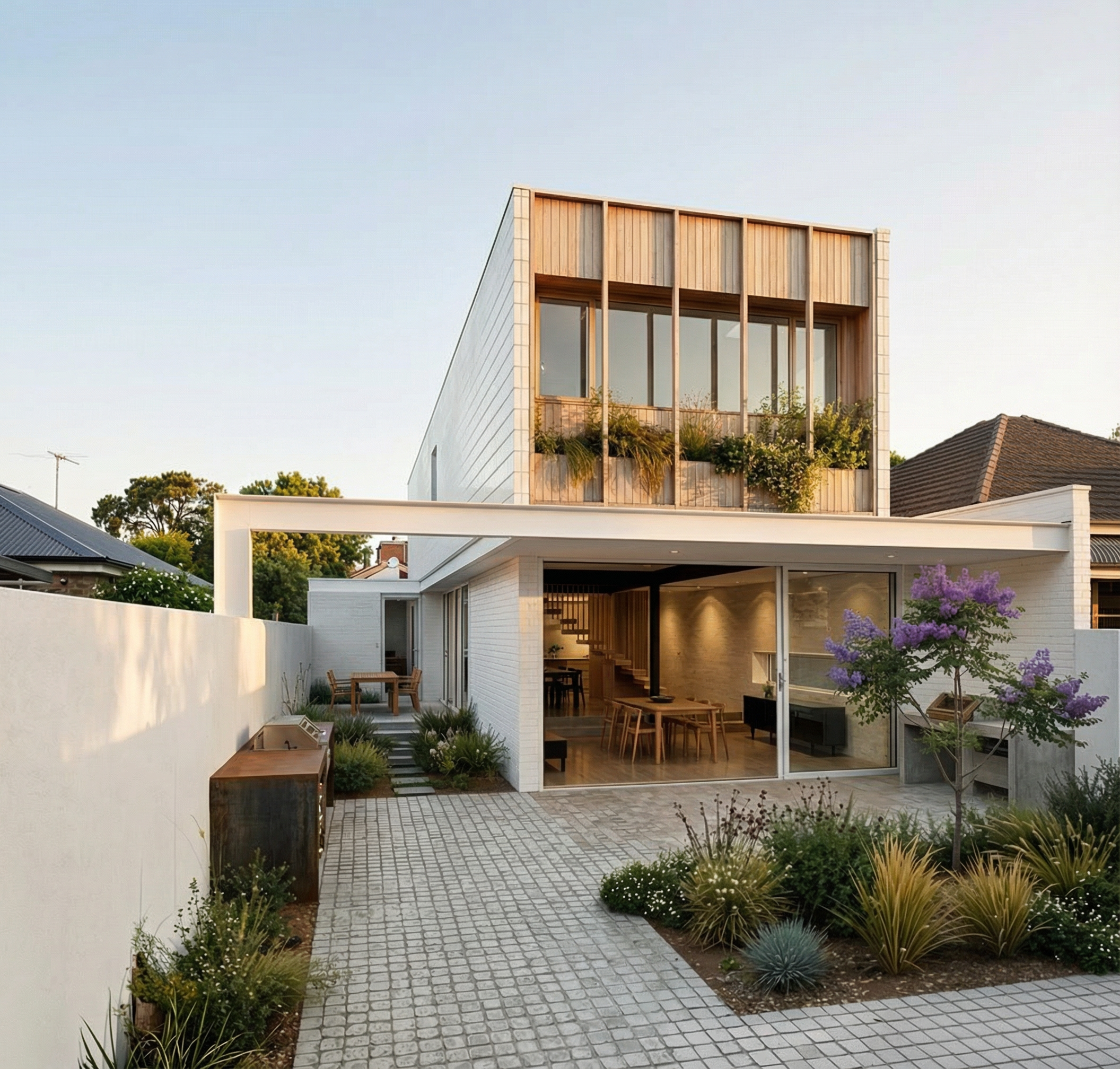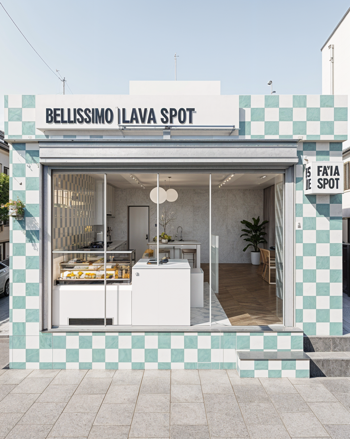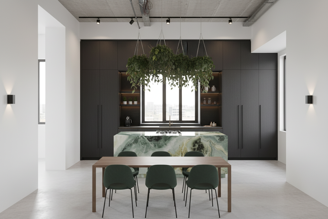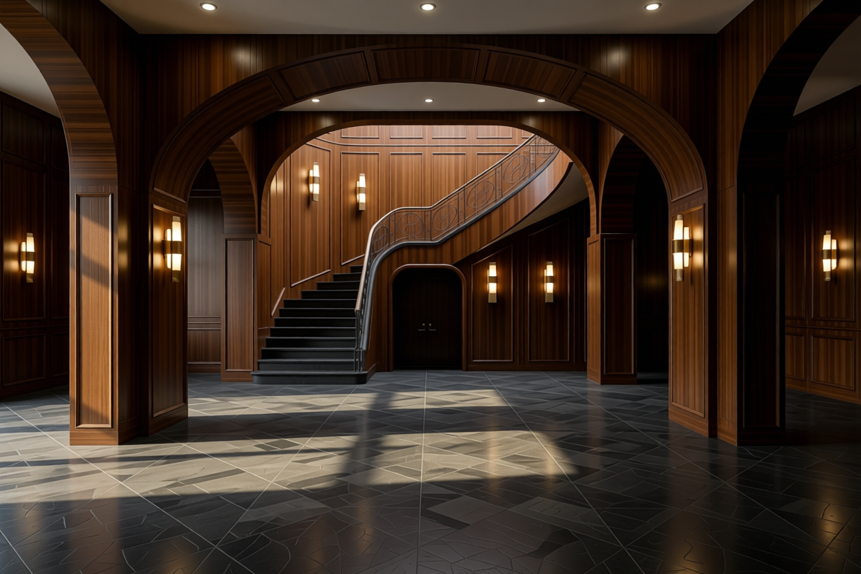 preserve the position the proportion the scale and the function of all architectural elements while removing the windows interior view of a hotel lobby staircase the floor is tiled with large modern elegant stone tiles in a refined geometric pattern walls and columns are clad with modern wooden panels in a minimalist style floating panels that stop short of the ceiling with no moldings or ornamentation the staircase features a sleek minimalistic railing in thin metal or wood linear and geometric complementing the architectural composition without visual clutter the atmosphere is dark and moody with warm ambient light enhancing texture and material richness lighting fixtures are minimalistic sculptural forms suspended geometric or linear shapes acting as artistic design elements the ceiling contains recessed lighting for subtle even illumination minimalistic composition only floor walls columns stairs railing ceiling and lighting all textures are rich tactile and realistic polished stone fine wood and matte metals ultra detailed photorealistic architectural visualization cinematic quality high end luxurious interior design
