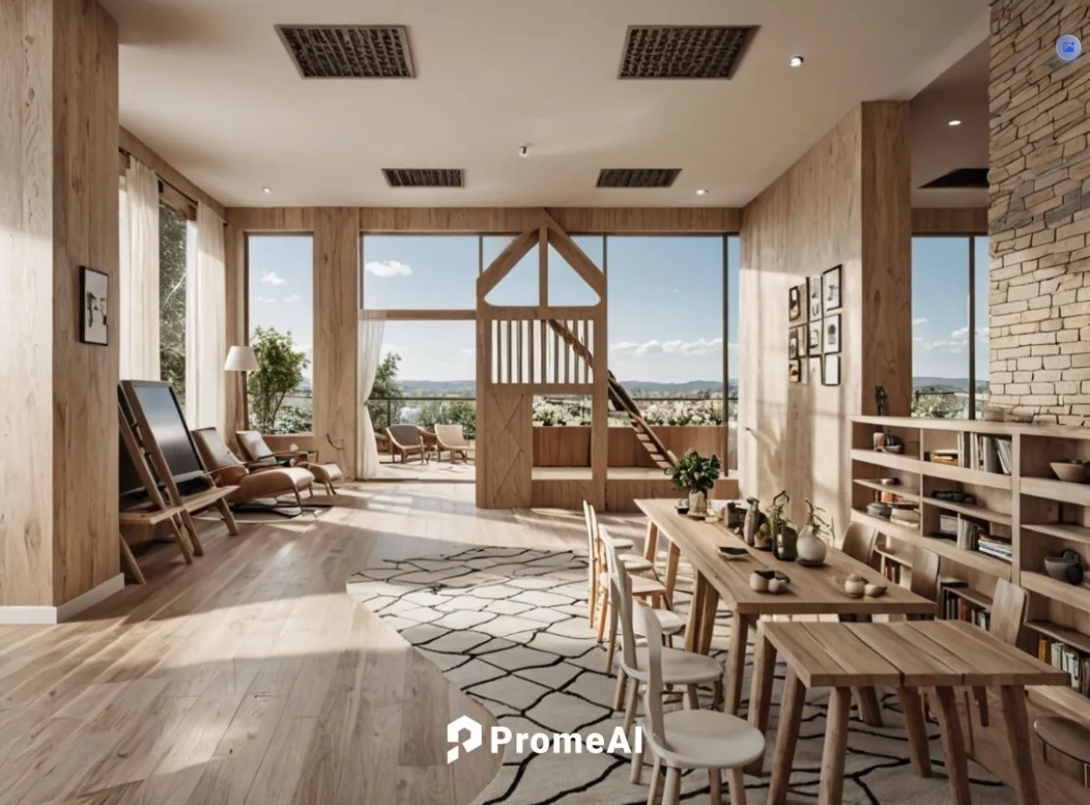 render a vibrant and playful children s playroom the atmosphere is bright and inviting with warm lighting the walls are soft gray accented with tall flowing white curtains the wooden play structure features a oak brown frame with a cheerful yellow slide adjacent are colorful rocking animals with red and blue highlights the floor is a rich wooden texture with a marigold yellow rug pathway leading through tables are lined up with pastel colored chairs in shades of blue pink and yellow open bookshelves are filled with colorful toys and books creating an organized yet lively environment the mood is joyful and imaginative perfect for children at play