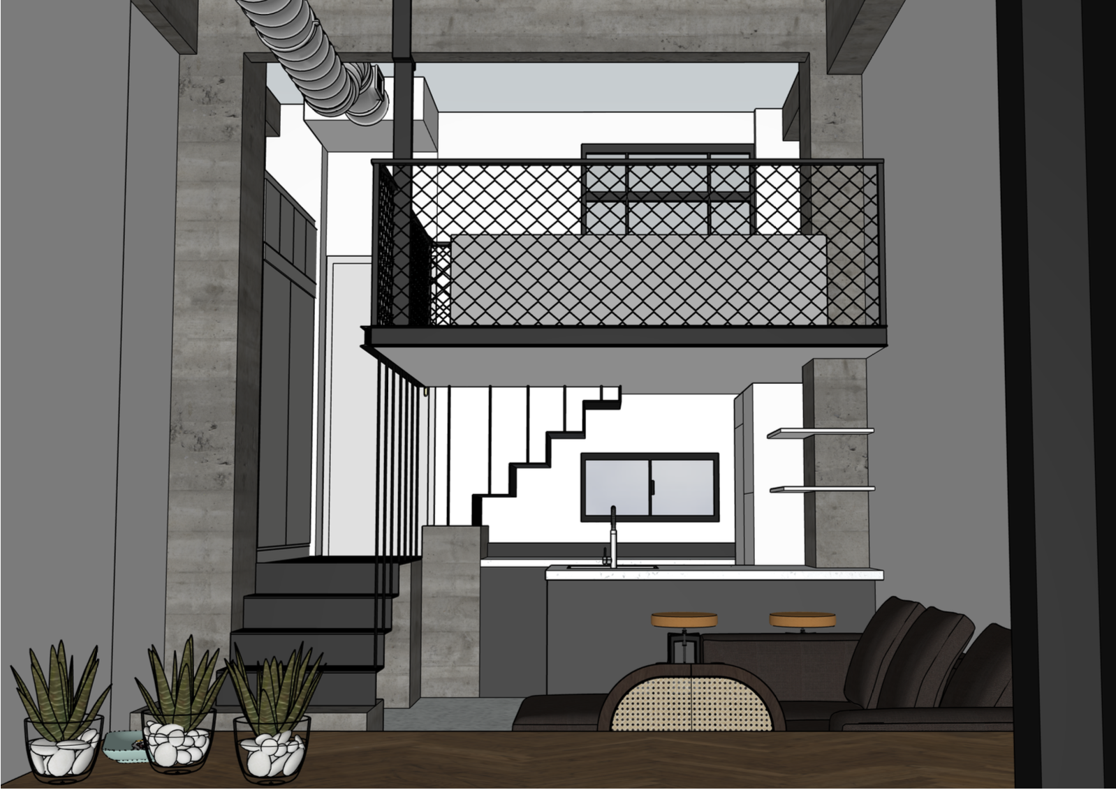 sustainable design interior shot materials black iron white walls and ceilings concrete columns and beams osb panels as floor of the loft architecture
