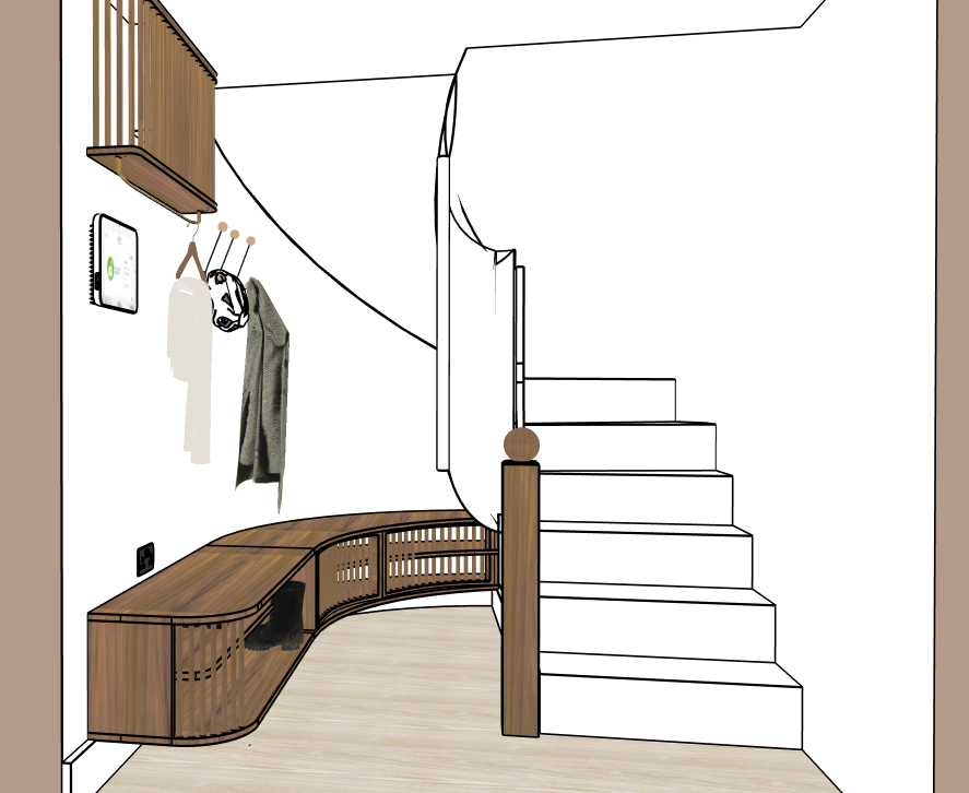 maintain all geometry design details stay true to the selections and their materiality in texture and color but bring in more lighting brightness variations the stairs going up are all white without edging