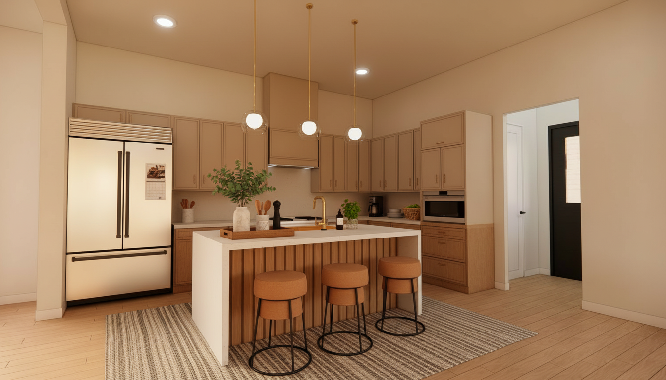photorealistic interior architectural photography illuminated interior lights soft directional light with realistic shadow falloff and gentle contrast bright but warm atmosphere realistic global illumination with subtle ambient occlusion in corners and at material transitions dslr with a 35mm lens eye level perspective professional architectural composition and framing and realistic depth slight depth of field foreground and midground in focus background softly flailing off physically based materials throughout with enhanced texture detail natural surface variation and subtle imperfections with realistic sheen warm color temperature balanced with natural daylight soft highlights realistic shadows gentle contrast subtle camera noise natural exposure not overly sharp soften corners and edges professional photography style do not change the geometry of the image remove the people from the image