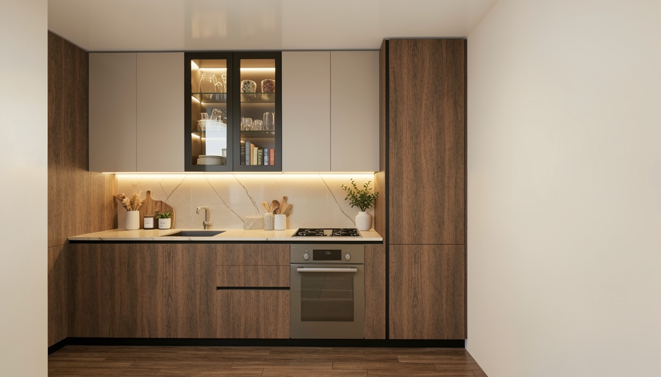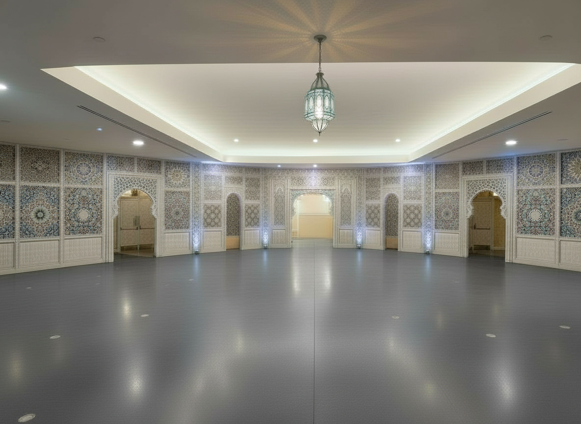 a grand interior room inspired by traditional middle eastern architecture adorned with intricate geometric patterns on the walls the walls are a blend of soft white and shades of blue and gray tiles creating an elegant mosaic design the arabesque arches framing doorways are meticulously crafted with ornate symmetrical designs the ceiling features a large decorative chandelier providing soft ambient lighting the floor is a polished muted gray reflecting the warm inviting glow from ceiling lights the overall atmosphere is serene and majestic with a harmonious blend of traditional elegance and modern sophistication