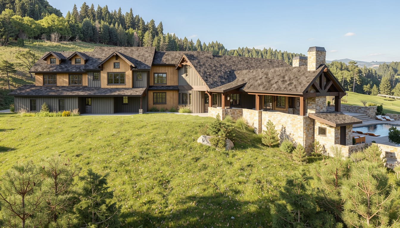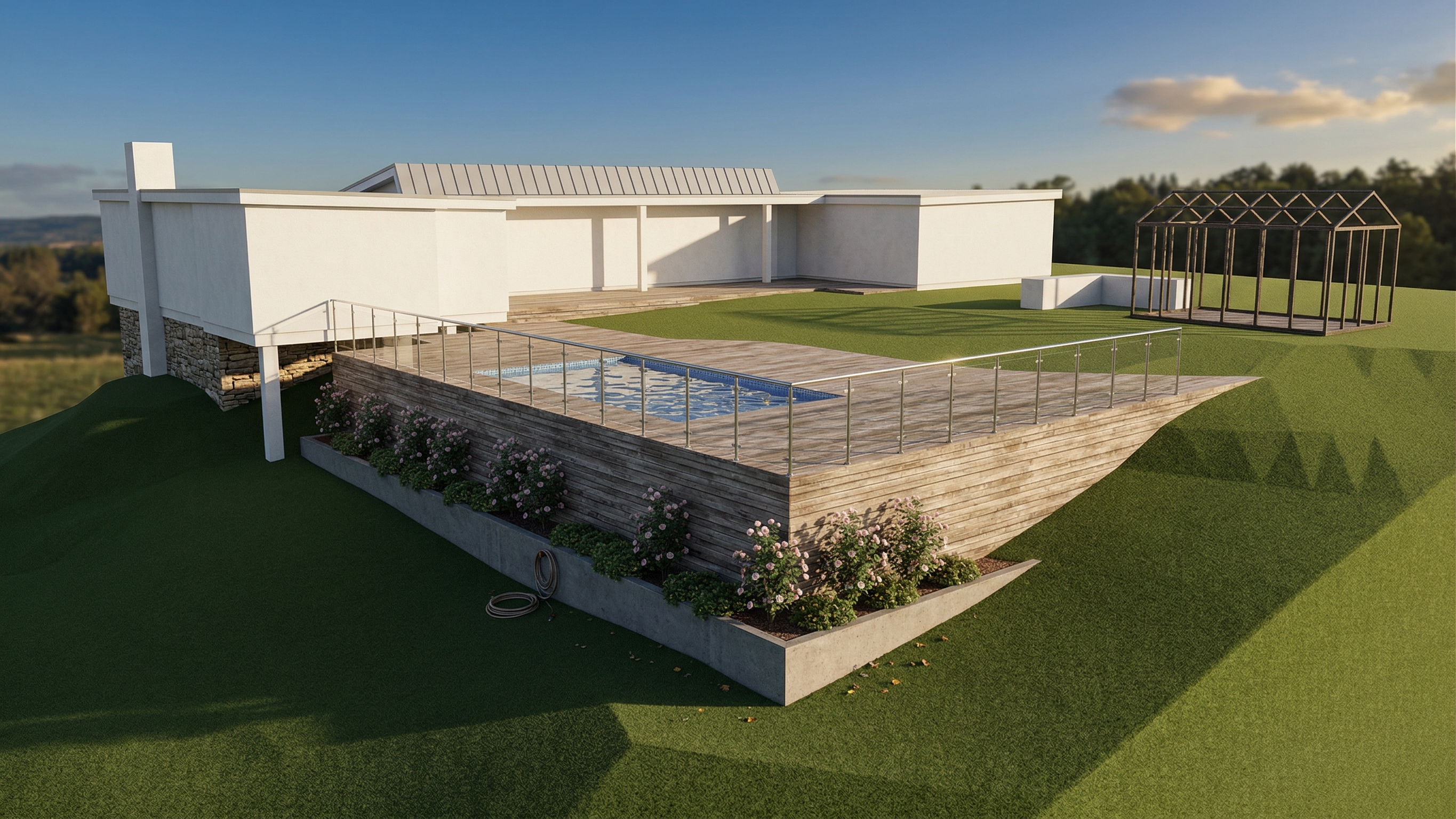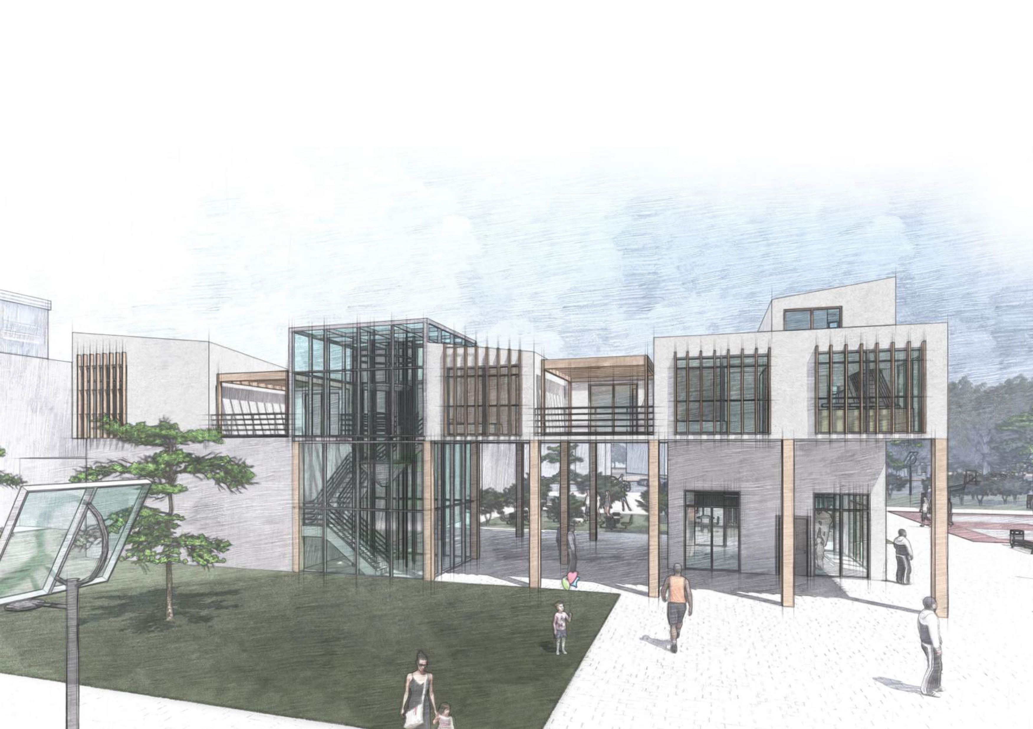 modern architectural building with glass facades and geometric design surrounded by greenery use soft white for the building light wooden tones for accents the glass should reflect a clear blue sky include lush green grass and trees with a lively atmosphere featuring diverse people walking the overall mood is welcoming and serene showcasing harmony between modern architecture and nature