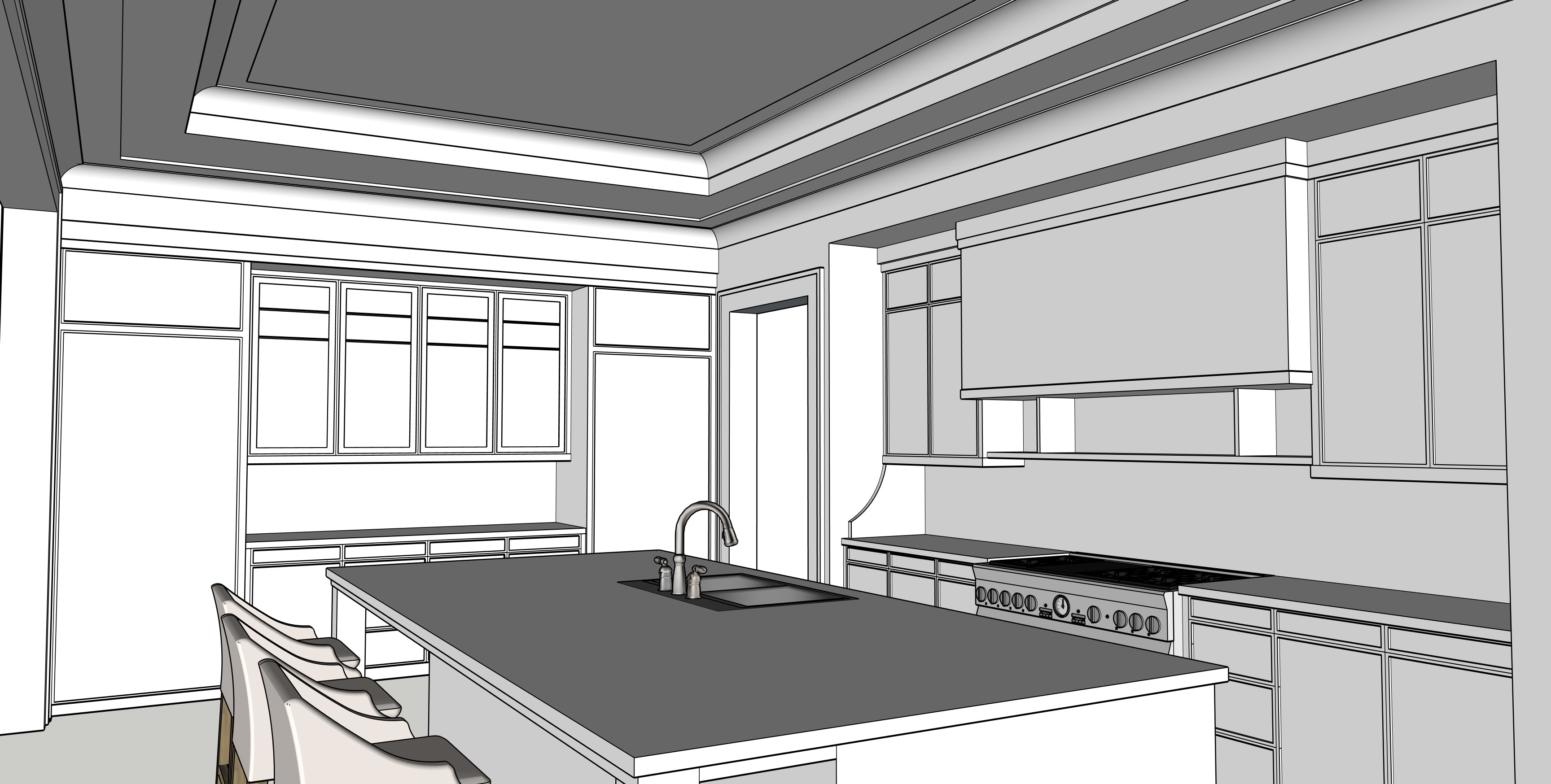 soft off white tones for walls and ceilings medium brown wood floors great lighting kitchen cabinetry to be slightly darker than wall color island to be slightly darker tone than kitchen cabinets add accessories to kitchen counter surface all cabinetry to be painted surfaces elegant and crisp detailing great lighting kitchen island and counters to be lighter colored marble run marble from counter surface to underside of cabinetry all painted cabinetry and cooktop on right of image