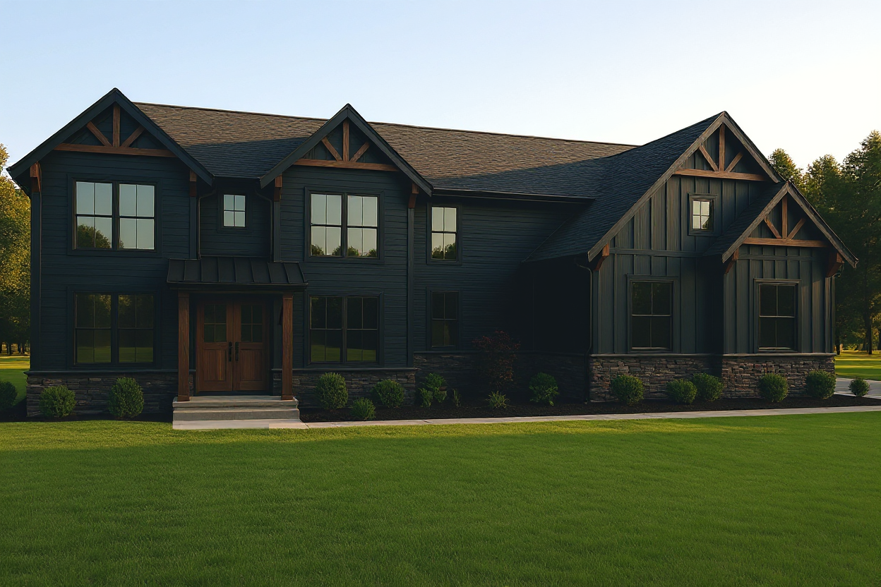 dark blue siding black windows black trim very dark wood accents stone vaneer only below the windows nowhere else