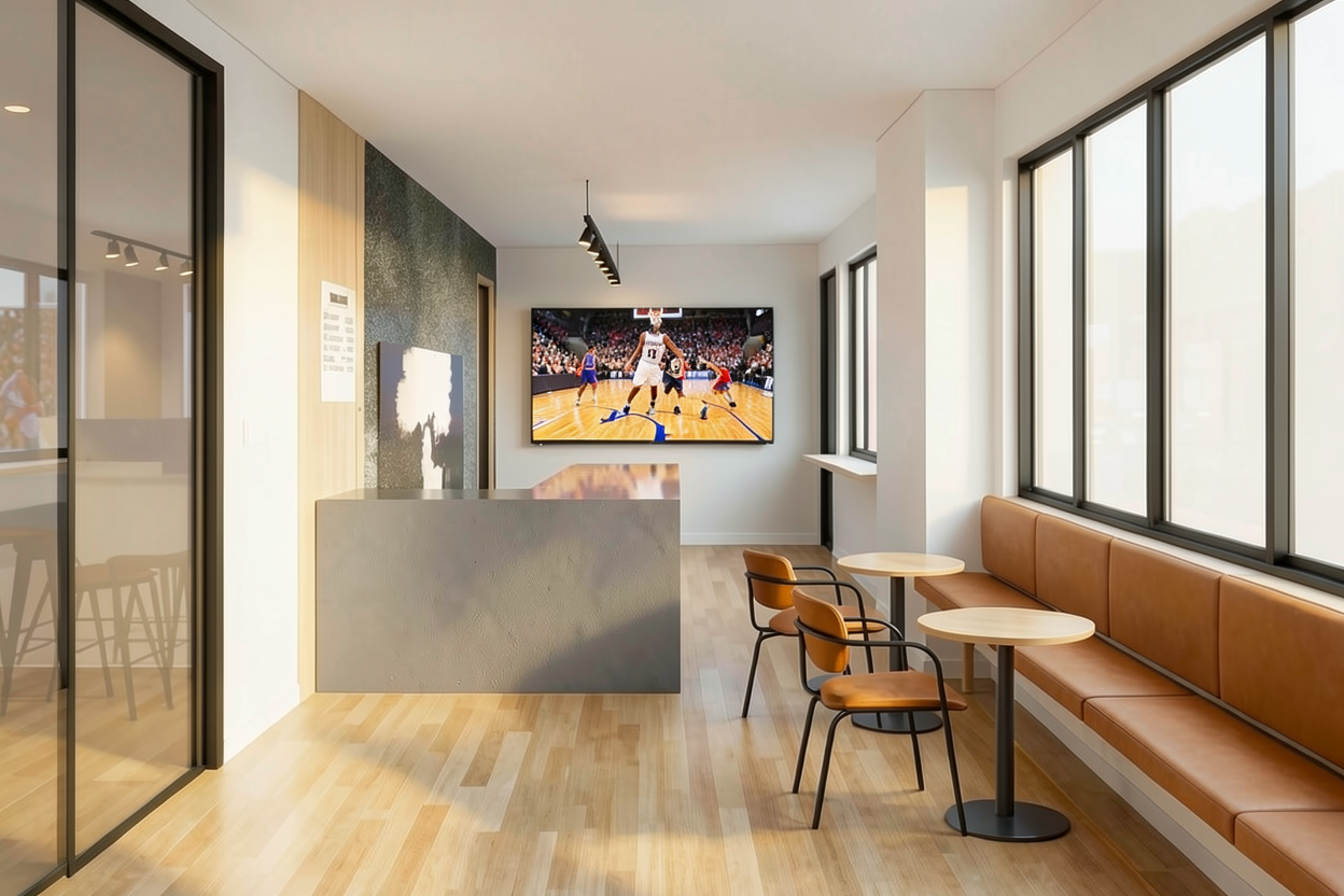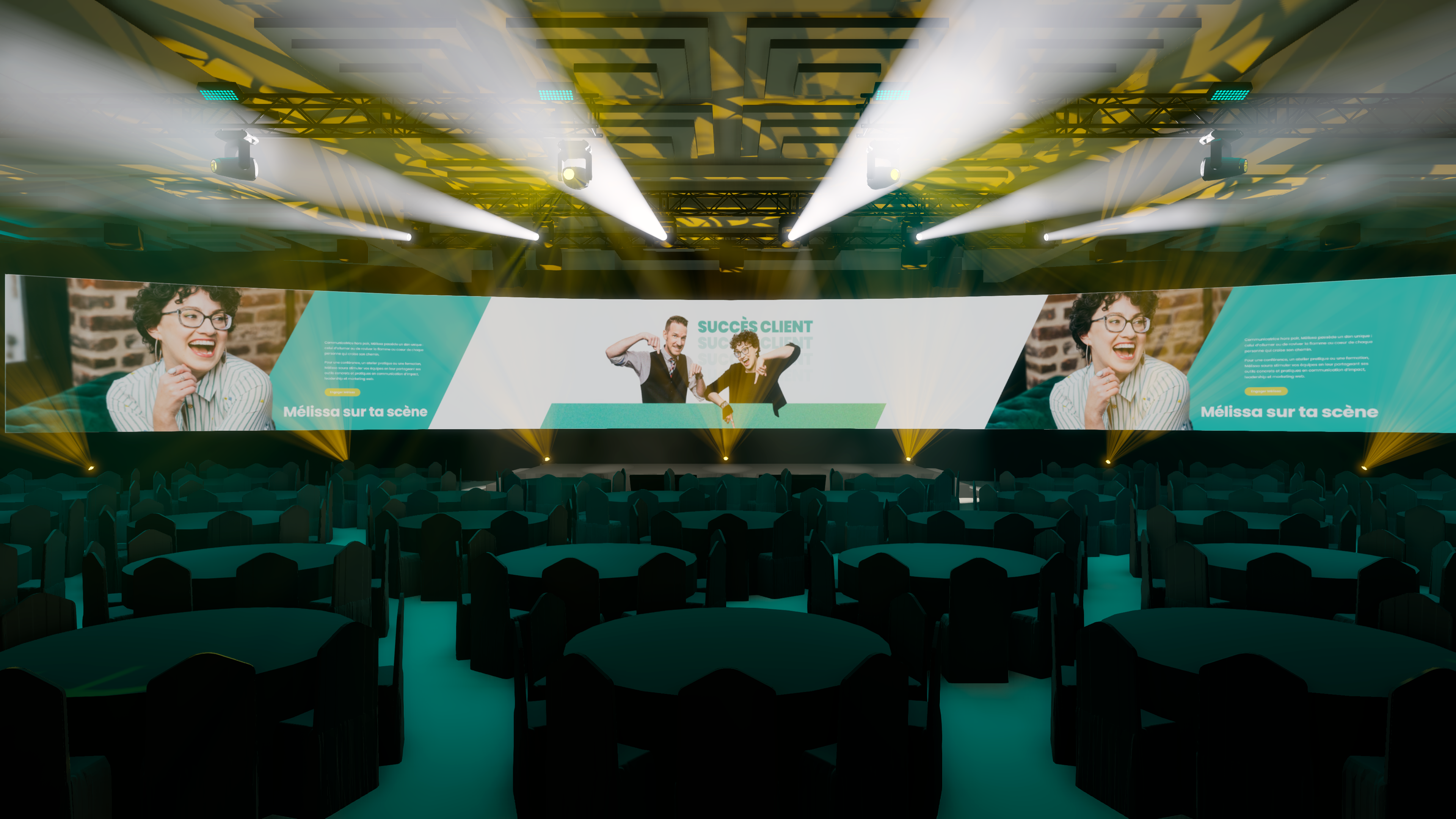 use the current image as a locked base reference do not modify stage layout architecture or camera angle any physical items stage truss chairs floor walls tables lighting fixture positions or types led screen content image curvature or color palette floor and ceiling materials and base tones table colors and turquoise lighting exactly as in the original image led screen keep the exact same image and colors screen is curved dimensions 115 wide x 12 high no resizing no movement no reinterpretation ceiling lighting non negotiable ceiling remains yellow entire ceiling fully covered with yellow gobo projection no uncovered ceiling areas gobo coverage must be continuous edge to edge visible light beams required beams originate from existing fixtures gobos and beams add texture and depth not brightness no new colors introduced lighting exposure overall room remains dark and controlled low ambient light level turquoise table lighting unchanged screen remains the primary visual focus additions only add seated participants in the existing chairs audience composition balanced mix slight majority men approx 55 45 younger average age 25 40 entrepreneur startup crowd casual professional attire audience density realistic not packed add one single presenter on stage centered neutral posture mood entrepreneur conference business summit dark modern architectural conference atmosphere not concert absolute rule anything not explicitly listed above must remain identical to the original image