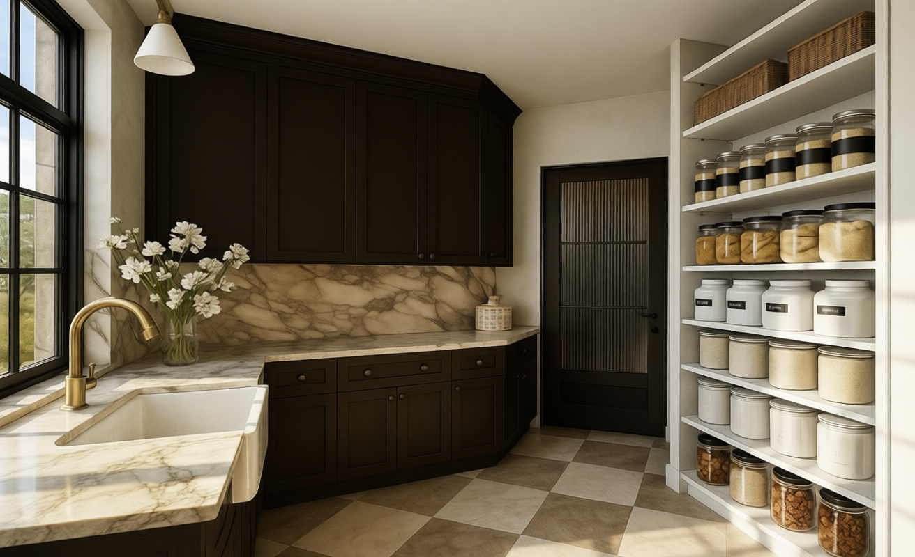 a modern two story house retain the exact structure colors darker and window arrangement rooflines siding foundation height and proportions exactly as shown in the reference image all second floor roofs are black shingles and lower roofs are metal as shown integrate into the terrain there is a lush dense forest of mixed hardwoods that are a little further back add cooler afternoon sunlight subtle dappled highlights across the siding and grass create ultra realistic lighting crisp shadows detailed textures in the siding and glass reflections and an overcast sky show only a few lights visible inside render in hyper realistic architectural visualization quality 8k resolution add a driveway tying into the concrete garage door apron make it the summer season