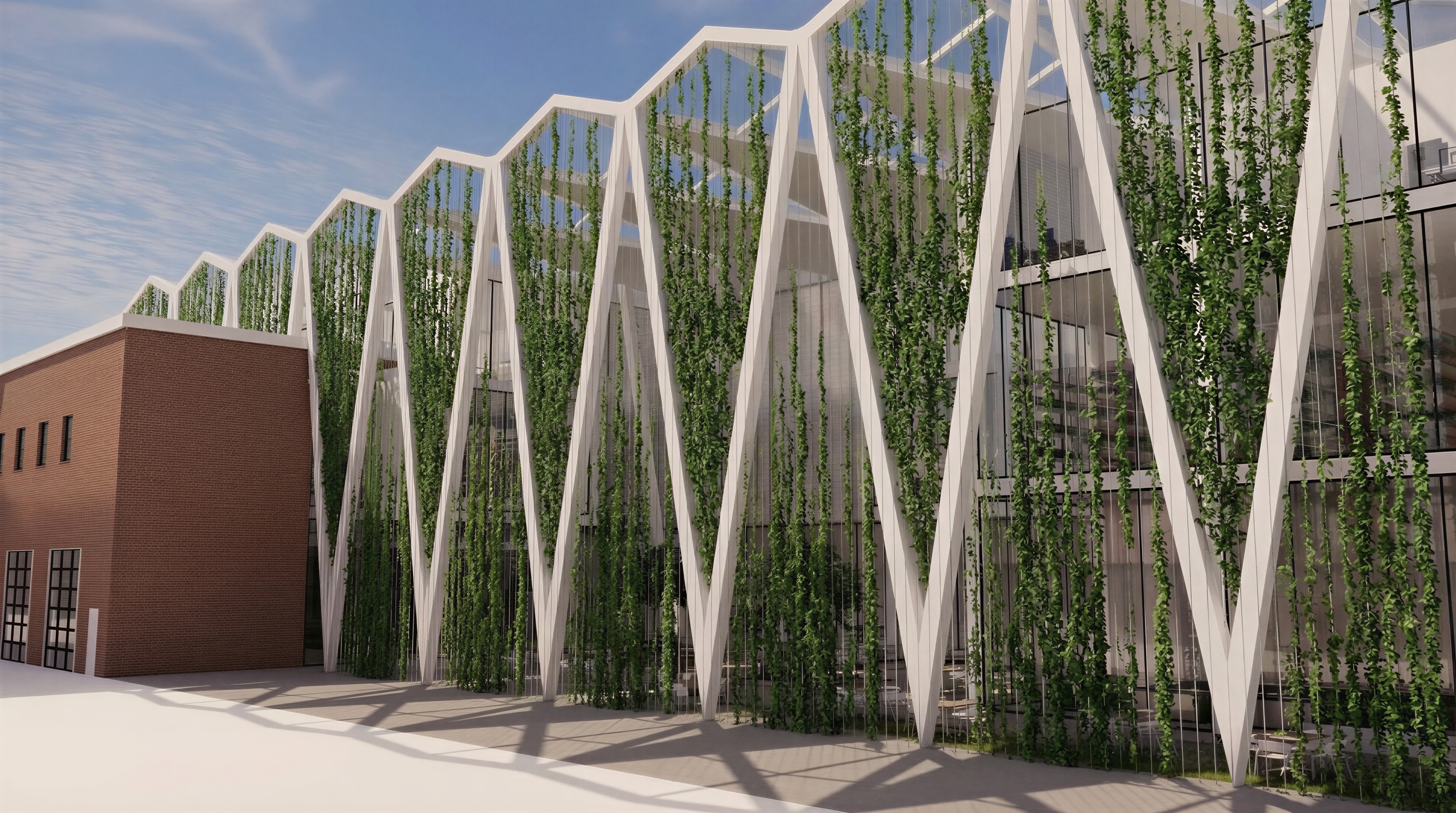 add realistic sidewalk and street context in front of the building with a clean concrete sidewalk and an asphalt street edge keep the camera angle and architecture exactly the same do not modify the fa ade vines columns or glass maintain the vine coverage exactly as shown add subtle street details like cast shadows curb lines and light texture but no people or cars replace the blank ground with realistic paving that matches natural perspective enhance the sky with a bright realistic atmosphere soft clouds natural daylight and subtle warmth while keeping overall lighting consistent with the original render