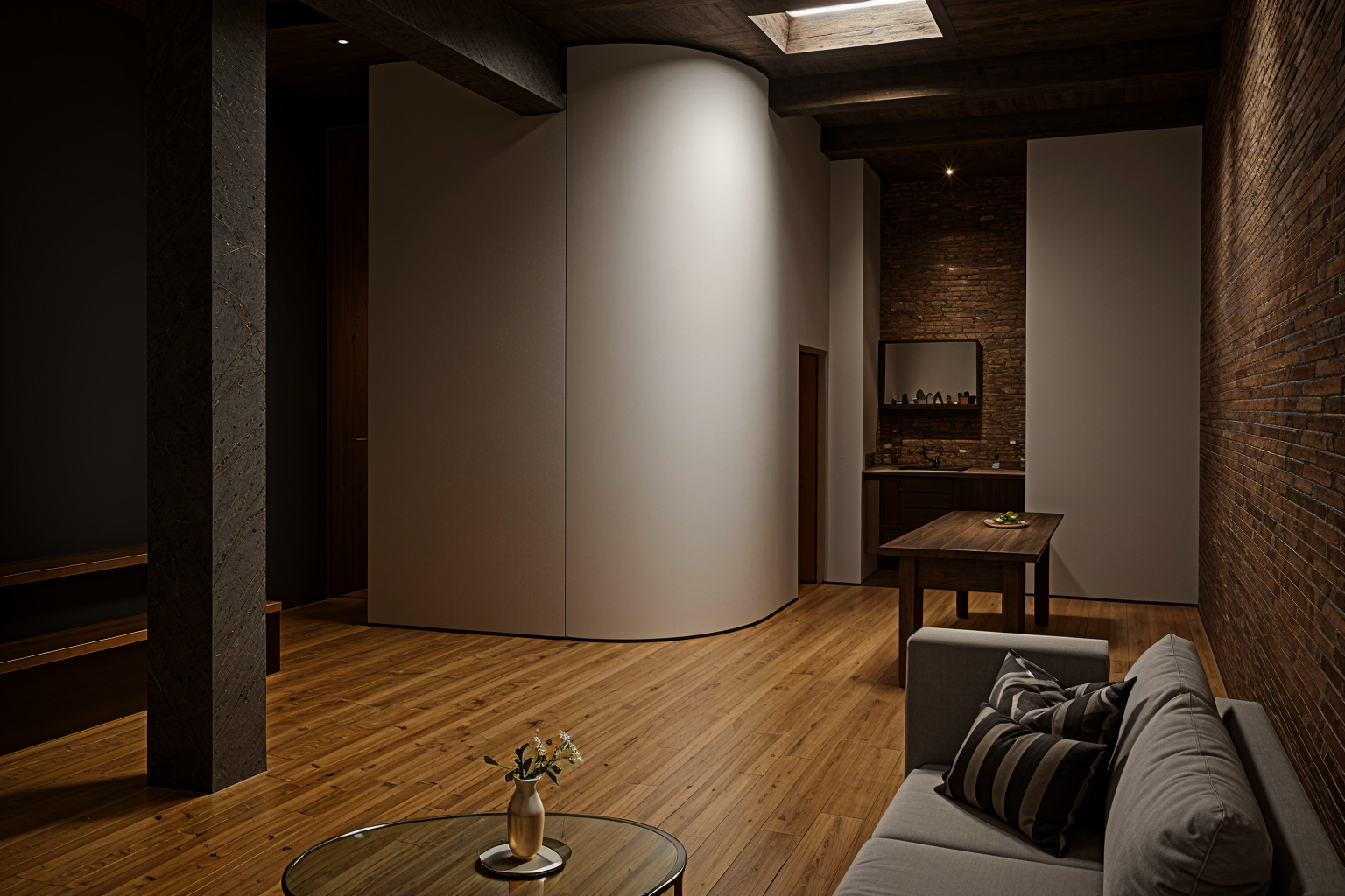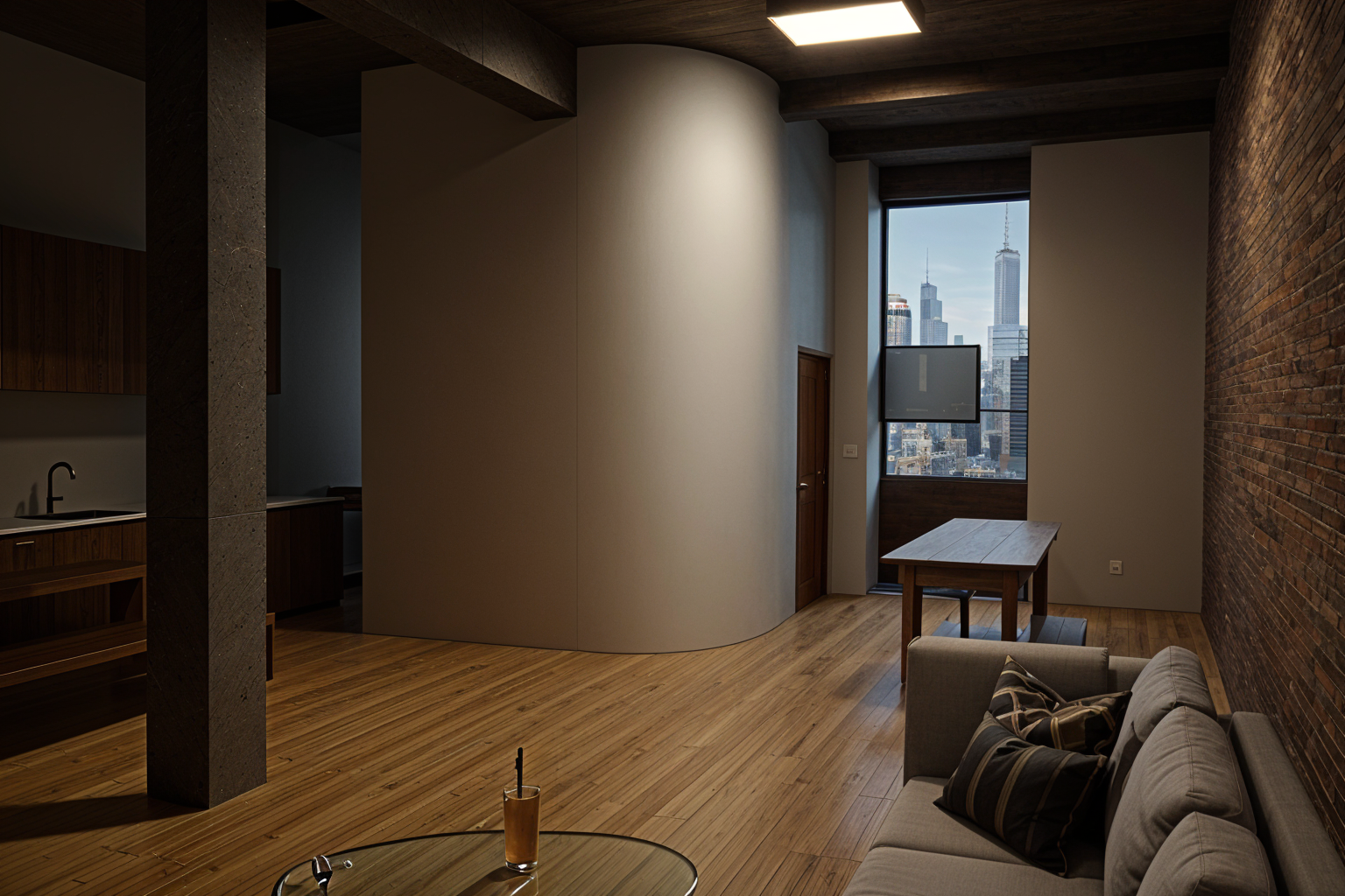 render this image to make it look real the vibe should be luxe new york city loft the walls on the left have wood shelves that should have books on them