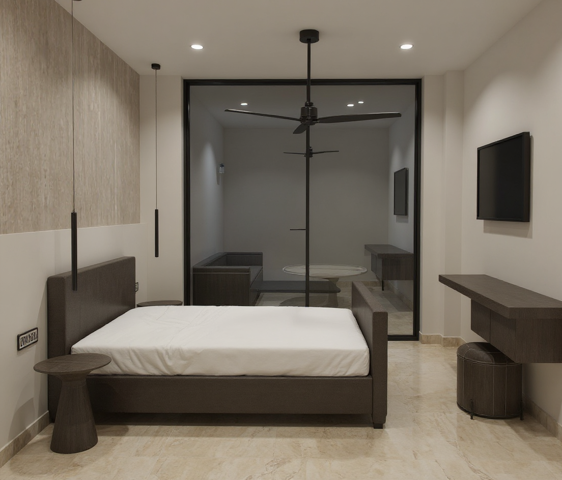 render a modern minimalist house elevation the house features sleek metal roofing in a matte charcoal gray the walls are finished with a smooth polymer plaster in a warm off white shade the windows and door frames are constructed from pvc a subtle light gray to complement the plaster the base of the building is accented with stone cladding in varying shades of light and dark gray the atmosphere is calm and contemporary set against a clear blue sky with soft ambient lighting highlighting the clean lines and materials don t add additional lines on the roof