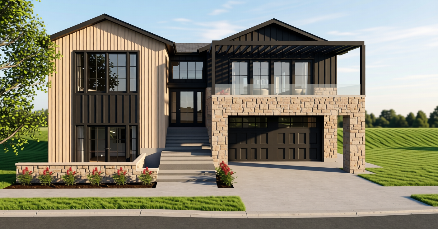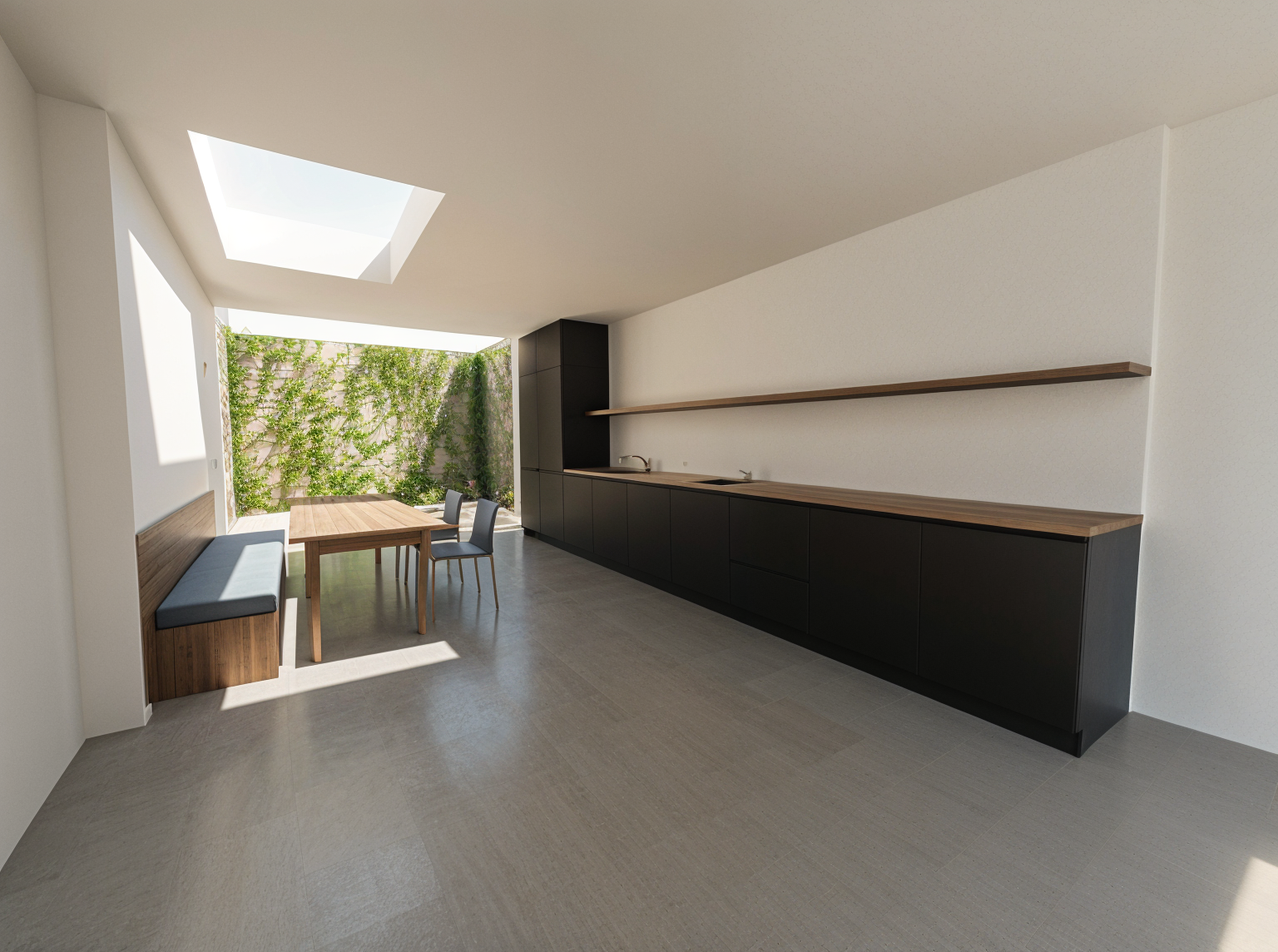 add a harmonica door open to the left with black frames 3 parts wooden oak light beige floor wall modern lighting on the kitchen wall spotlights on the ceiling oven on the tall unit white back splash and wooden shelve skylight looking and plants and sky