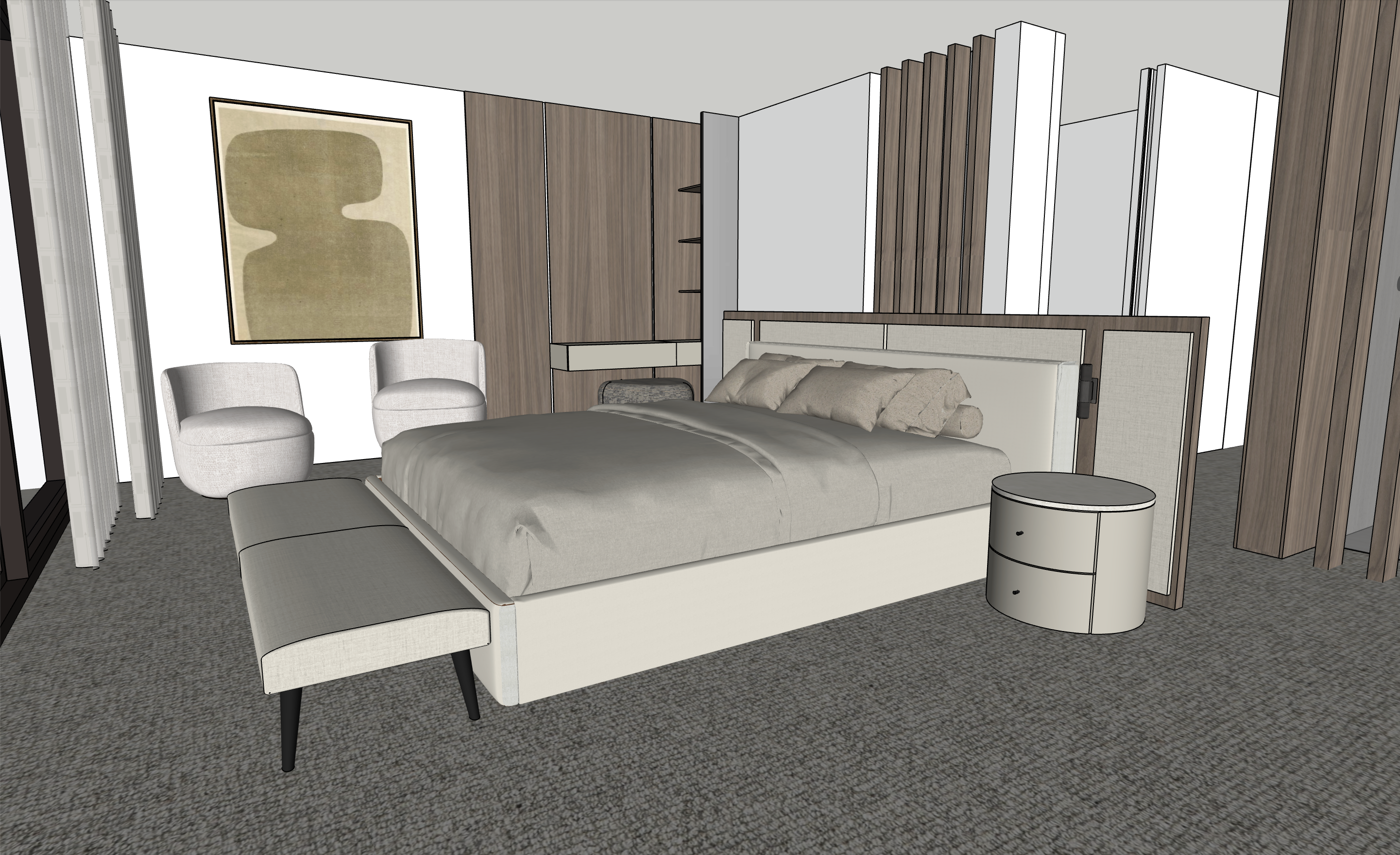 create a clean and crisp photorealistic image from the attached photo do not change the shape of furniture or accessories but increase the quality of textures this is to be a penthouse master bedroom with tall wood louvres at the back and wood paneling for dressing table