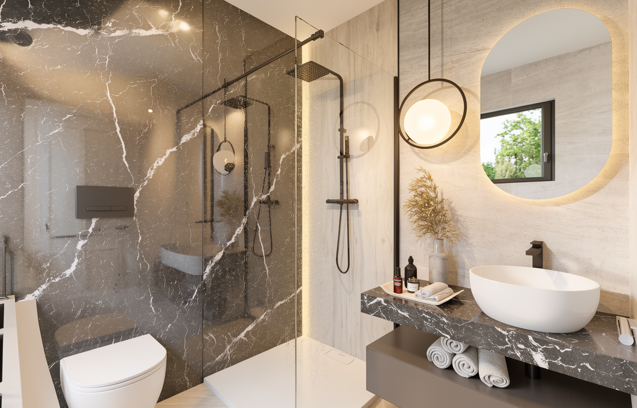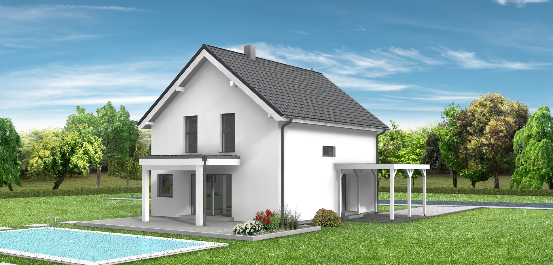 erstelle exakt f r dieses bild eine realistische werbeansicht die ma e von haus und fenstern d rfen nicht ver ndert werden dach und fenster grau fassade wei