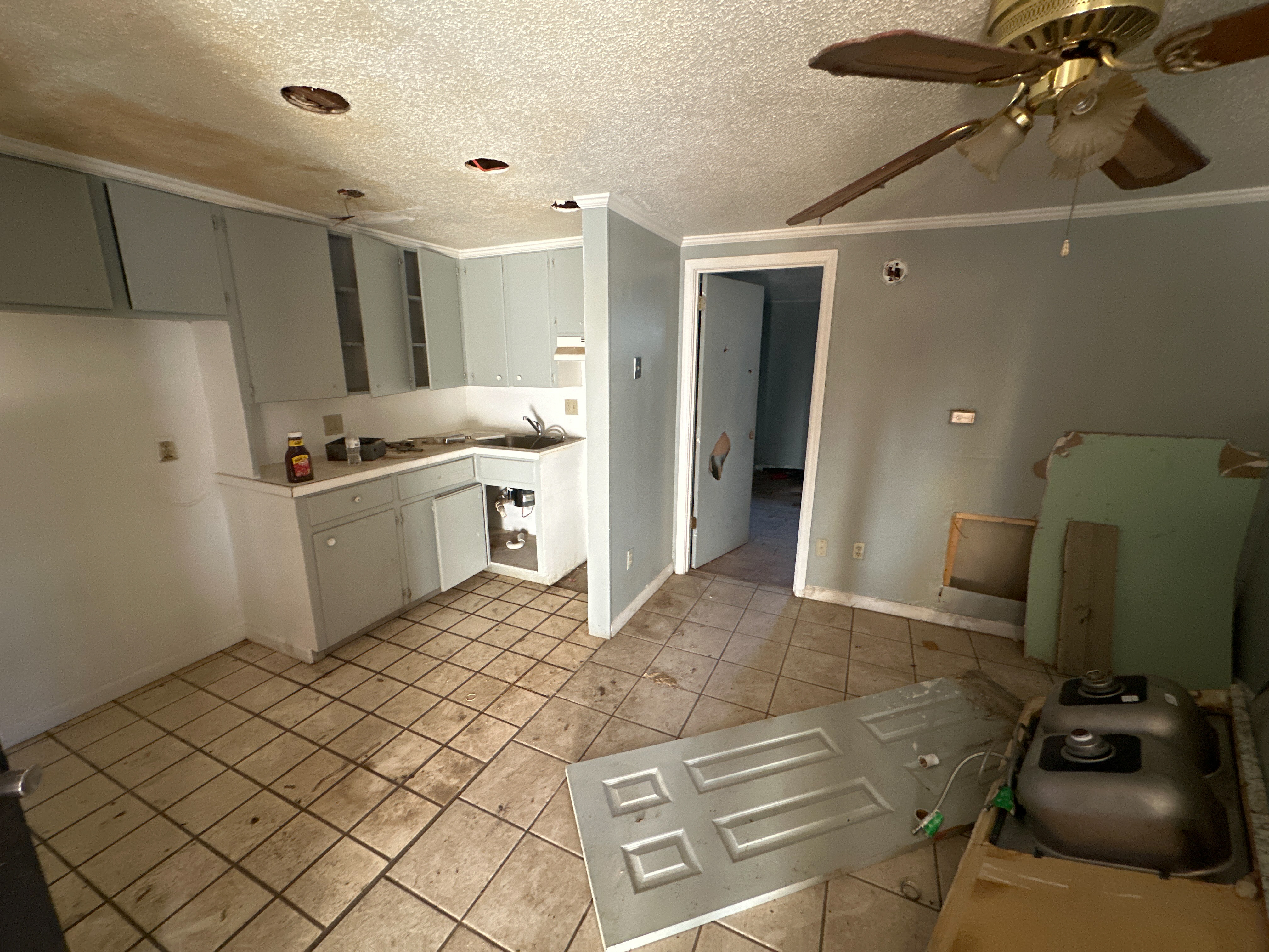 photorealistic renovation of the provided room without changing layout or camera replace all kitchen cabinets with white full overlay shaker and modern black pulls stainless fridge without waterdispenser added at left end with uppers above add 24 30 inch stainless range to right of sink with simple stainless hood and shaker cabinet above repair ceiling and install 4 inch white trim recessed lights at existing holes swap fan for modern white low profile fan with light replace all tile with warm white oak flooring like southern luxe surfside across all visible spaces repair drywall and paint all walls soft white with white trim replace bedroom door hardware with modern black lever add a small 2 person dining set near the new refrigerator in the left foreground stage a compact living area on the right light sofa coffee table low console keep clear walkways show a neatly made bed visible through the rear bedroom doorway remove all debris and damage bright neutral daylight and clean realistic details do not add anything else other than what is in this prompt do not add any windows or doors or remove any walls