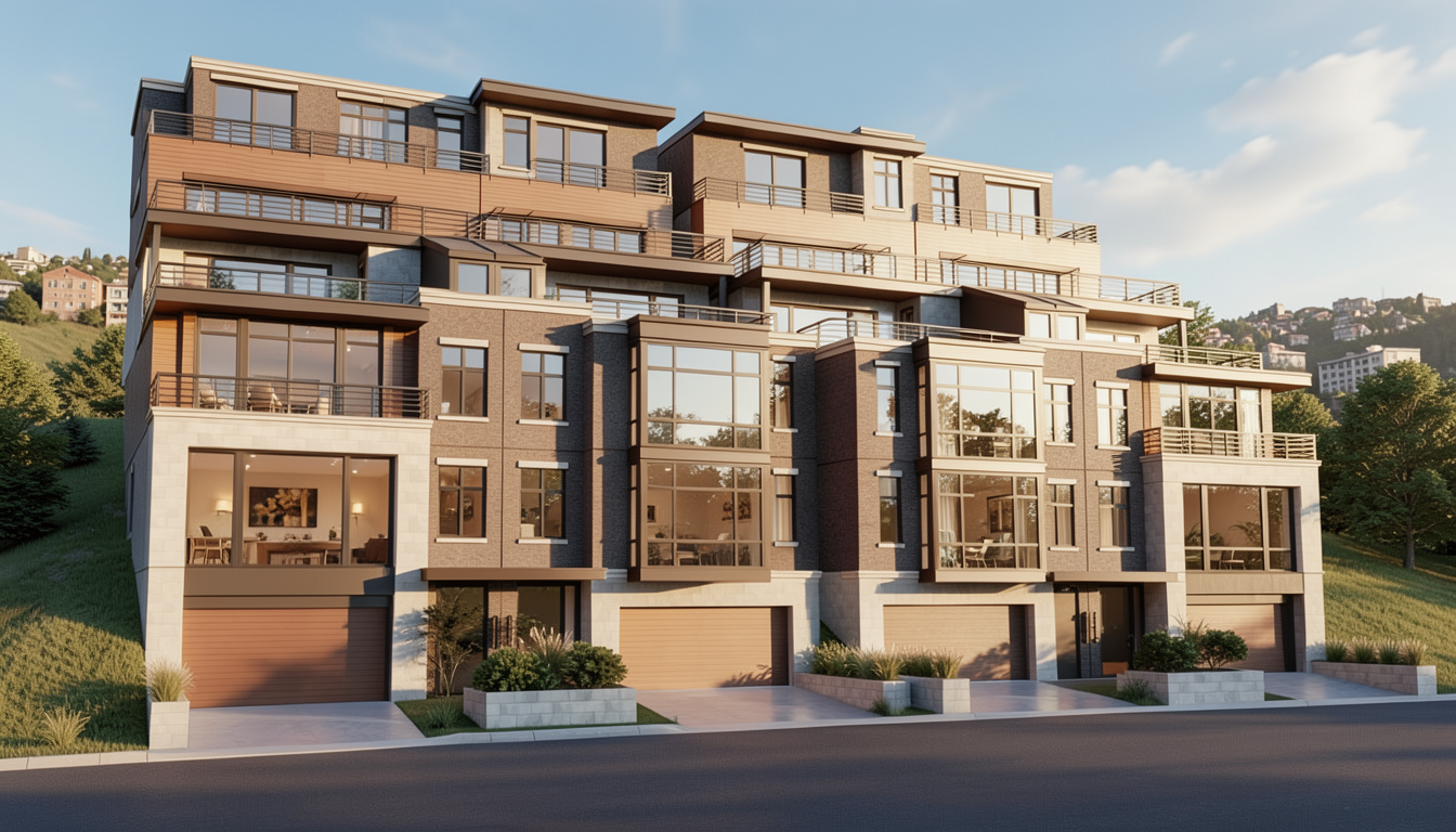 autumn realistic greige siding with brown trim concrete foundation light wooden fence sunny day