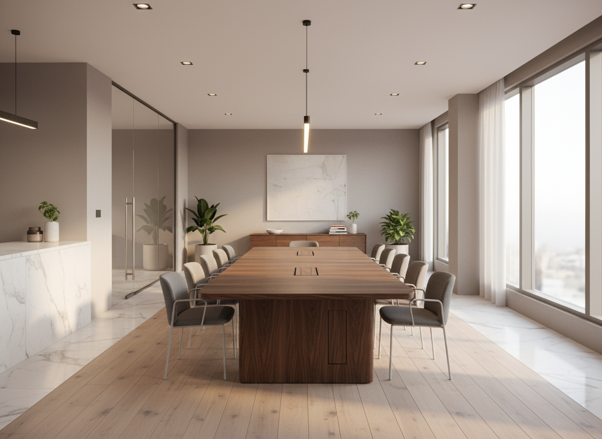 aerial view of a modern building in a small town surrounded by traditional houses with red tiled roofs the main building features a sleek gray rooftop and lush green rooftop garden streets and sidewalks are paved in a soft gray tone complementing the vibrant greenery of the scattered trees and lawns the sky is creating a serene and harmonious atmosphere