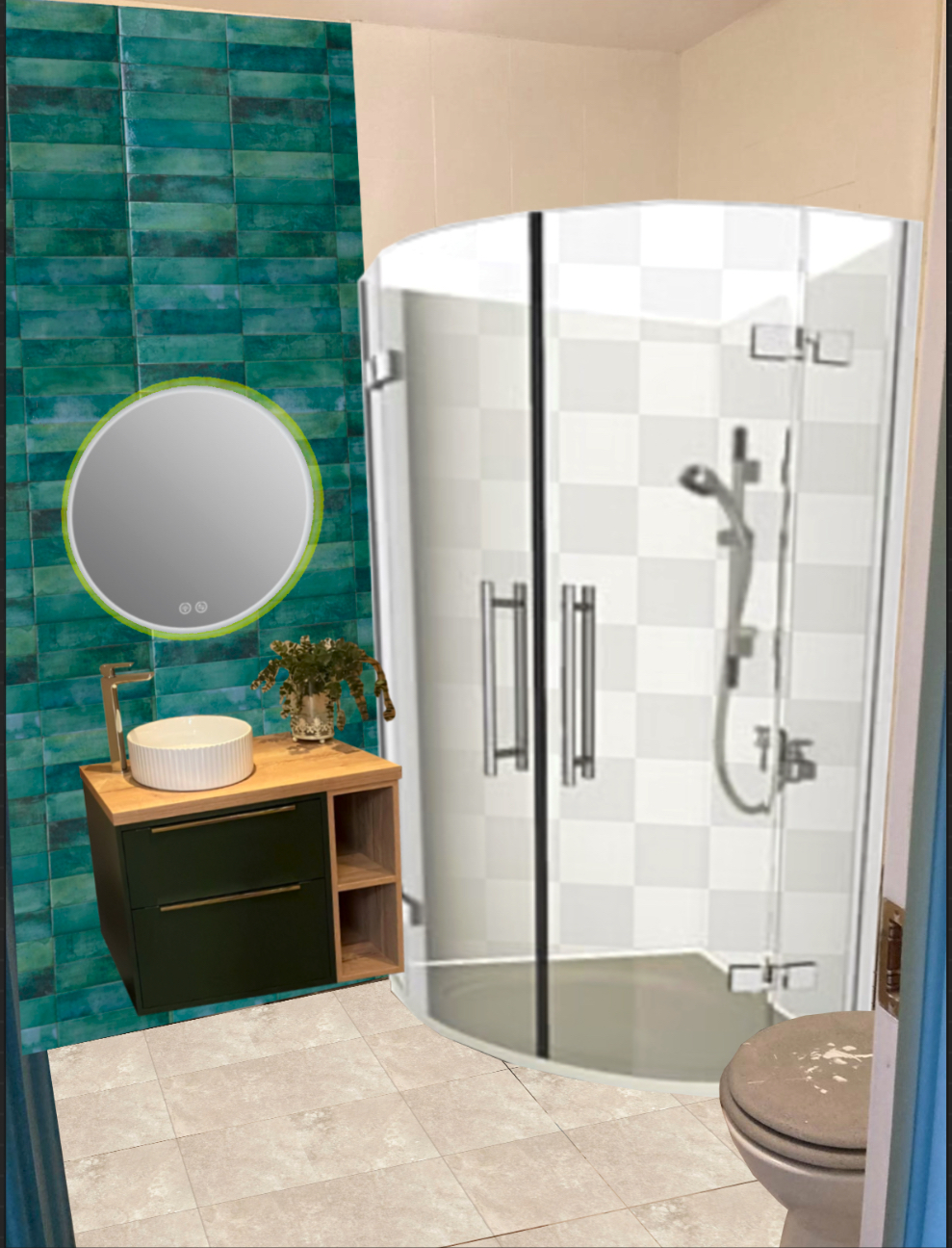 interior shot a modern bathroom with an elegant and serene atmosphere the wall features deep emerald green tiles creating a luxurious backdrop the shower area has clear glass with a subtle frosted texture a circular mirror with a thin soft green border hangs above a wooden vanity which has a white ceramic sink the vanity cabinet is a dark forest green with natural wood shelving the floor is covered with light beige tiles offering a warm contrast to the vibrant green tones the room is softly lit enhancing the tranquil and clean ambiance