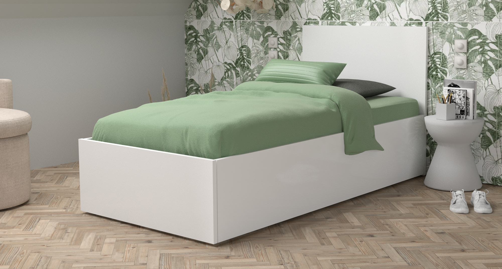 chambre coucher minimaliste et chaleureuse style japandi wabi sabi ambiance zen et l gante lit double centr literie en lin froiss aux tons beige repli s sous le matelas cru et cr me draps l g rement d faits plaid beige drap deux tables de chevet blanc sym triques design pur chacune d cor e d un vase minimaliste avec des fleurs s ch es aux teintes naturelles mur principal habill d un papier peint textur ton sable avec motifs organiques en lignes fines et ondul es voquant des paysages topographiques ou des montagnes abstraites sol en parquet en bois clair tapis doux et discret sous le lit lumi re naturelle douce entrant par le dessus par des velux en haut gauche clairage mural noir mat minimaliste sur le mur droit atmosph re calme luxueuse mais sobre espace harmonieux proportions r alistes textures tr s d taill es rendu photor aliste clairage global doux profondeur de champ l g re haute d finition style magazine de design int rieur prompt negatif ne change pas le d cor de meuble