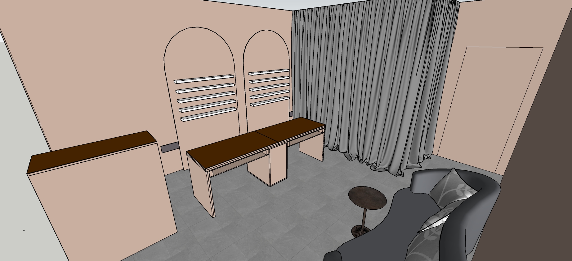 can you render this image its a nail salloon can you add led behind the wall half round shelfs and add sun light a little the brown counter tops are brown glass