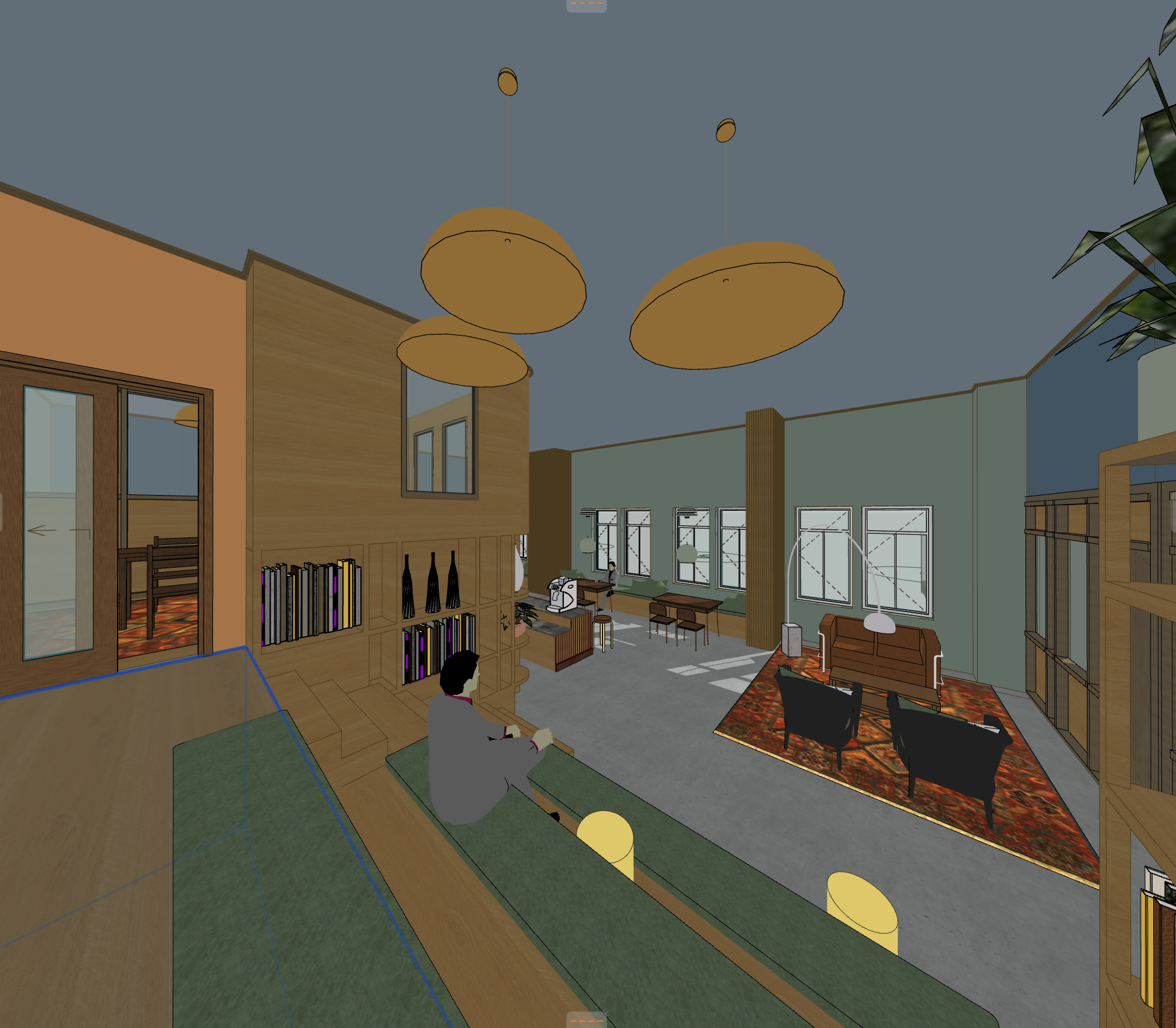 create a beautiful tiered seating area from light oak with beautiful amounts of sunlight coming through the windows keep true to the reference image