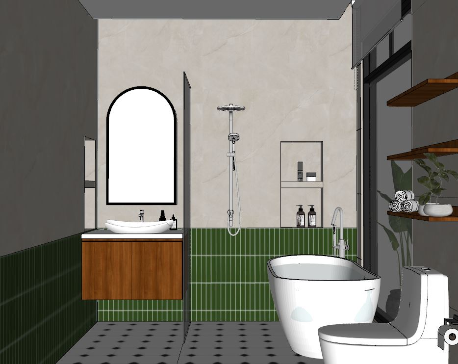 create ultra realistic images without changing any structure shape design or materials do not resize jpegs add indirect light to curtain valance and all around the mirror and add spotlight to ceiling and add soft outdoor light make the wall glossy and the floor is matte