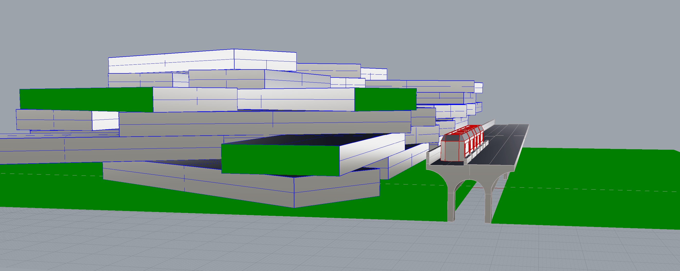 i want to see a drawing of the provided image the image should include people walking on the pathway next to the train which is in a red outline and the green hatches should be turned into vegetation the building blue should have some windows and should have moss walls green facades on the green hatches keep it a 2d image