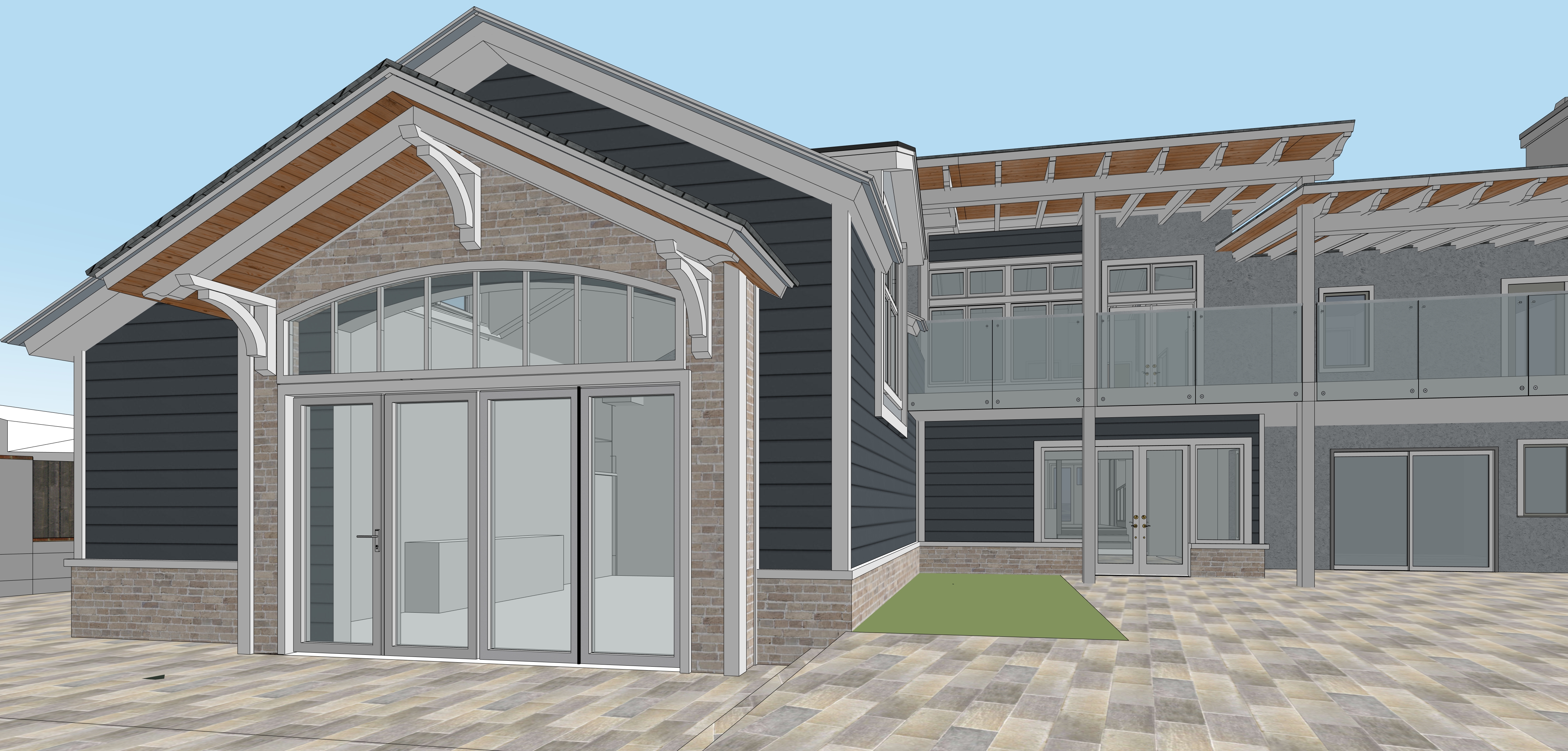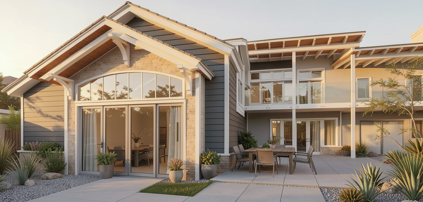 patio with furniture minimalist drought tolderant landscaping garden beds golden hour