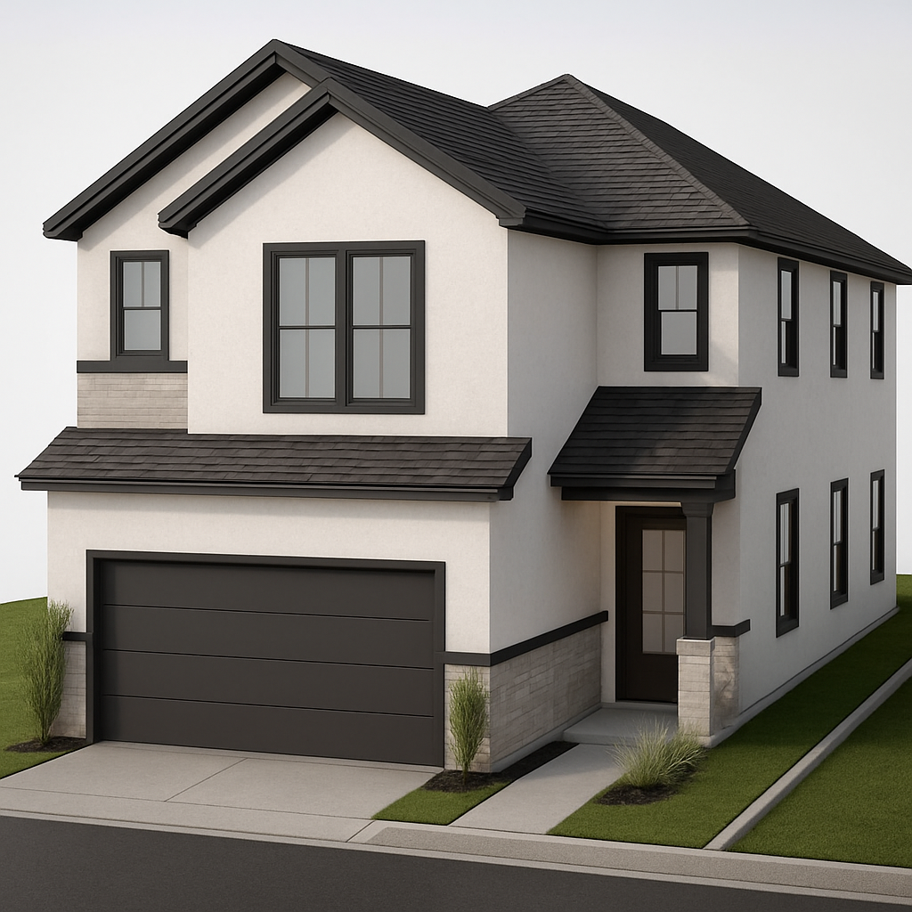 please make the front facade on the right side of the image where the three windows are in the same white color brick as the rest of the home remove the drawing of the people and the black lines on the left of the front door