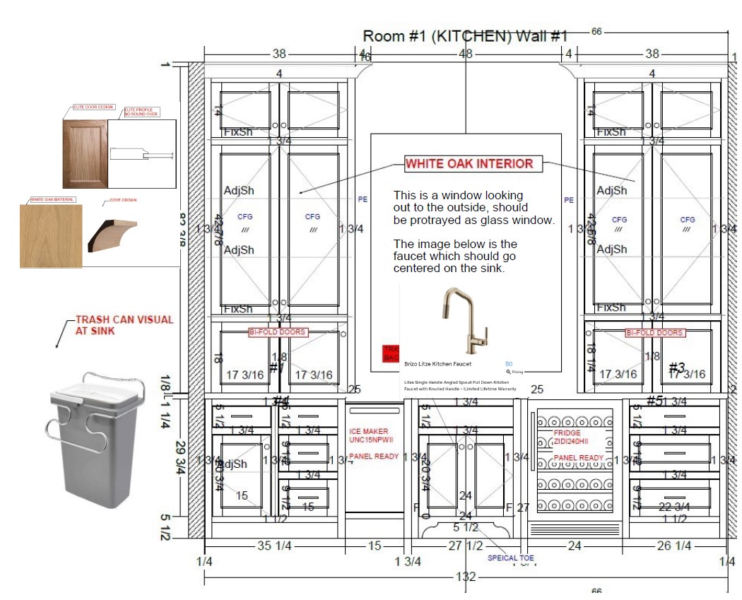please generate a beautiful kitchen elevation for the wall shown it is a total of 132 with the center being a glass window looking onto the outside each side are cabinets at 38 please copy the cabinetry and draws to a tea the cabinet finish door style and crown molding is included in the image also we show the faucet which will be in the center of sink the countertop material is the following absolute black leather granite the backsplash material is the following calacatta castana quartz please show all finishes and render the drawing as such underneath the glass cabinets are bifold doors each side symmetric to the right of the sink is wine fridge to the left is an ice machine then three drawers then a drawer and below is a cabinet for the trash all shown in the image above please match the measurements a detail of the attached image the glass cabinetry goes from top to the countertop as the bottom are bifold doors only the center is open