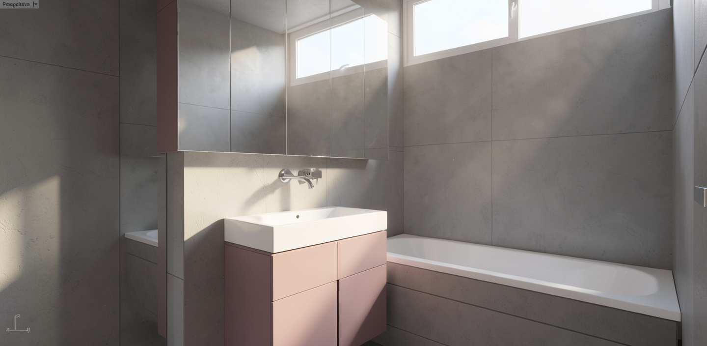 enhance the lighting atmosphere only adjust only the lighting use natural cinematic lighting soft shadows realistic global illumination and subtle light contrast to create a warm atmospheric scene on the cabinet in the center the doors should have a simple straight vertical gap only do not add any cutouts decorative elements or drawers enhance the lighting atmosphere only adjust only the lighting use natural cinematic lighting soft shadows realistic global illumination and subtle light contrast to create a warm atmospheric scene change only the cabinet doors in the center so that they are completely flat and straight do not add cutouts handles decorations or drawers enhance the lighting atmosphere only adjust only the lighting use natural cinematic lighting soft shadows realistic global illumination and subtle light contrast to create a warm atmospheric scene materials and colors in the bathroom should be as follows walls and floor gray microcement sink and bathtub white cabinet under the sink dusty pink staroru ov cabinet above the sink mirrored window above the bathtub white glass enhance the lighting atmosphere only adjust only the lighting use natural cinematic lighting soft shadows realistic global illumination and subtle light contrast to create a warm atmospheric scene materials and design in the bathroom should be as follows walls and floor gray microcement smooth and seamless with no tiles or grout lines sink and bathtub white cabinet under the sink dusty pink staroru ov cabinet above the sink fully mirrored completely reflective on all surfaces window above the bathtub single pane white glass not divided enhance the lighting atmosphere only adjust only the lighting use natural cinematic lighting soft shadows realistic global illumination and subtle light contrast to create a warm atmospheric scene the window above the bathtub should be a simple single pane window with no opening mechanism do not change its size frame material or any other objects in the scene do not modify any other geometry materials colors textures furniture or architectural elements preserve everything else exactly as it is
