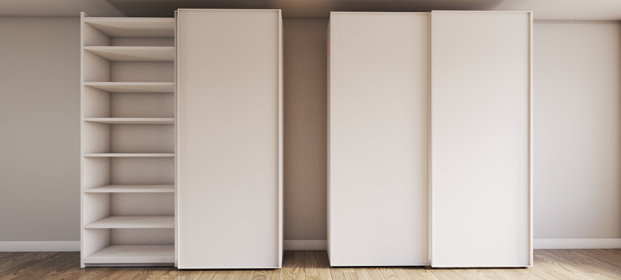 a modern wardrobe with open shelves next to sleek sliding doors the wardrobe is matte white set against light beige walls the floor is polished natural wood adding warmth the atmosphere is serene and minimalist with soft diffused lighting illuminating the room gently