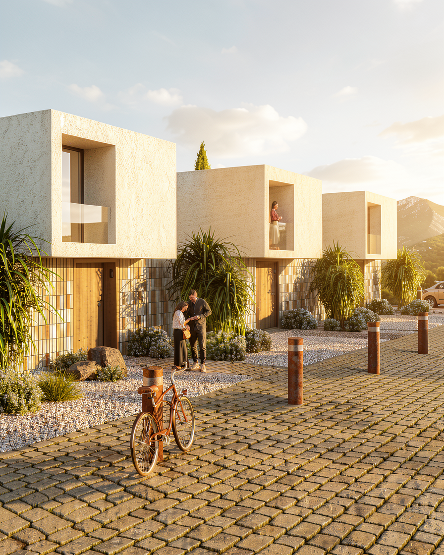 image type hyper realistic architectural render mediterranean residential street scene framing keep exact same camera position framing composition and perspective target object strictly isolated edit only modify the cylindrical metal street bollards foreground vertical posts along the curb these are rust colored corten steel elements placed on the cobblestone street edge allowed modification only this reduce bollard scale to 40 50 of current size target real dimensions height 70 90 cm diameter 10 15 cm keep same positions spacing alignment and material critical constraints this is the key do not modify any other object in the image do not change textures materials lighting or colors of buildings pavement plants sky or people do not alter cobblestone pattern or ground geometry do not change lighting conditions or color grading do not restylize or re render the image do not modify contrast exposure or atmosphere do not modify the bicycle vegetation or architecture reinforcement muy importante para archsynth preserve 100 of the original image except for bollard scale perform a localized edit only on bollards no global changes no material reinterpretation no style transfer if unable to isolate bollards do not modify the image