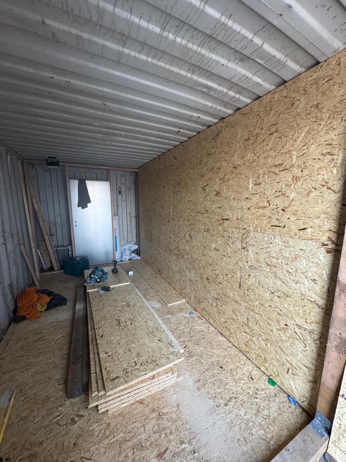 interior shot zen japandi office lobby interior inside an industrial container size 4 1 x 2 3 meters ceiling height 2 3 meters functional modern workspace with calm hotel lobby atmosphere light beech wood slatted floor continuing onto the back wall matte natural finish warm sand or clay toned microcement side walls handcrafted texture no grey tones ceiling with delicate beech wood grid and white natural jute panels softly backlit with hidden warm led lighting 2700k stopsol bronze tinted glass entrance framed in light beech wood minimalist beech wood desk placed along the side wall ergonomic fabric office chair in beige tones integrated coffee corner with built in beech wood cabinet minimalist espresso machine ceramic cups natural linen rug subtle textiles bonsai tree calm productivity hotel lobby meets office japandi zen style earthy natural spa mood ultra realistic architectural visualization cinematic lighting