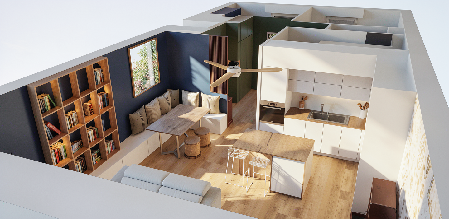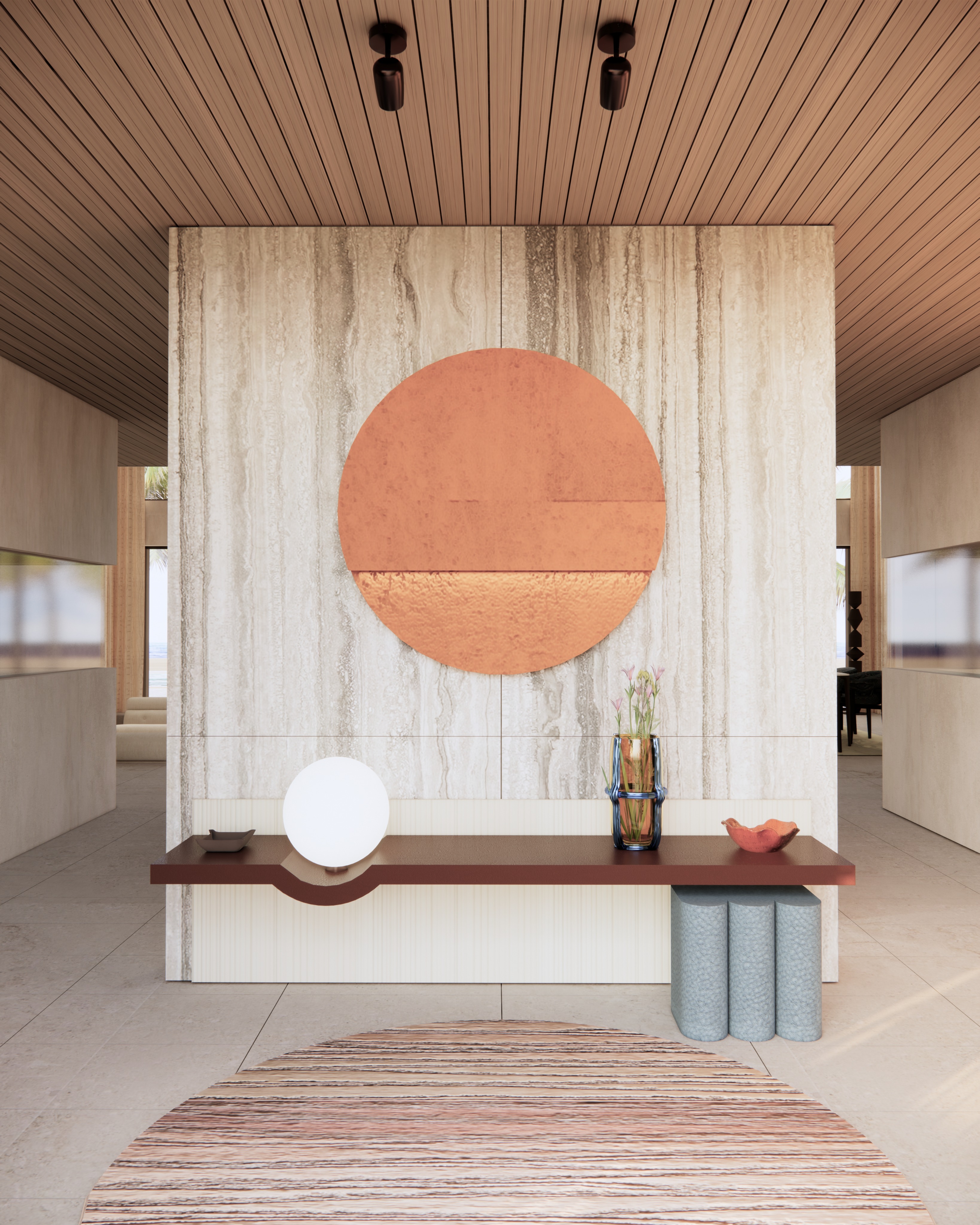 enhance this render into a soft photorealistic coastal scene while preserving all architectural details materials furniture placement camera angle and composition exactly as shown do not change the design layout landscaping or colors reduce the contrast slightly and create an airy summery mood gentle shadows warm highlights enhance realism textures reflections wood stone glass and water while keeping the original palette light warm and neutral