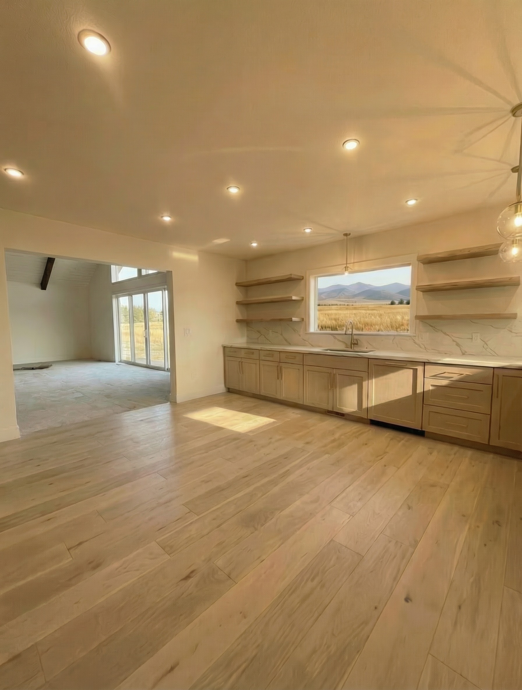 do not change anything else but the following stain the floating shelves to match the wooden beams