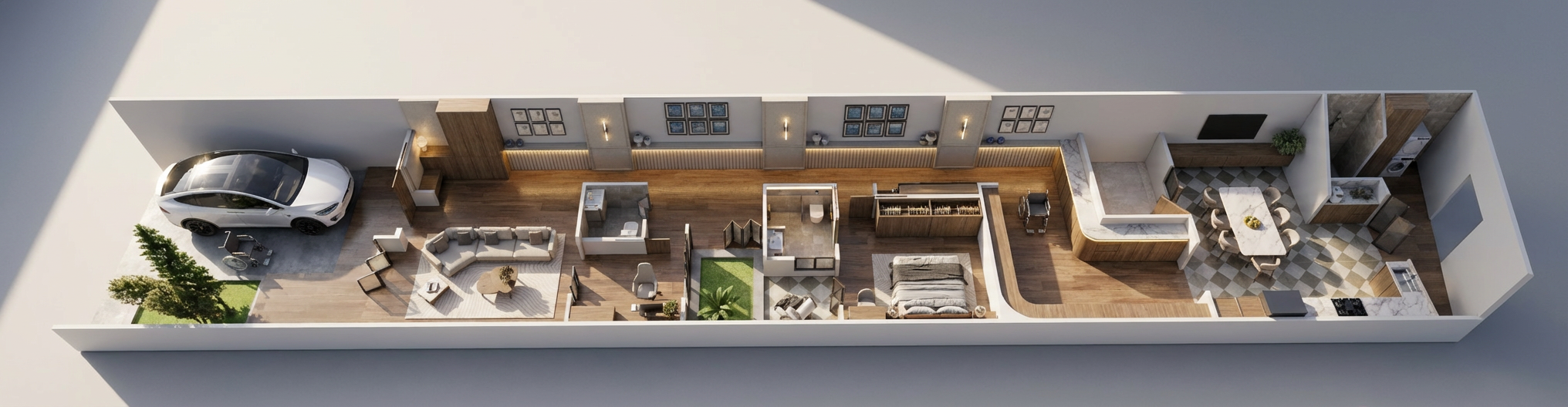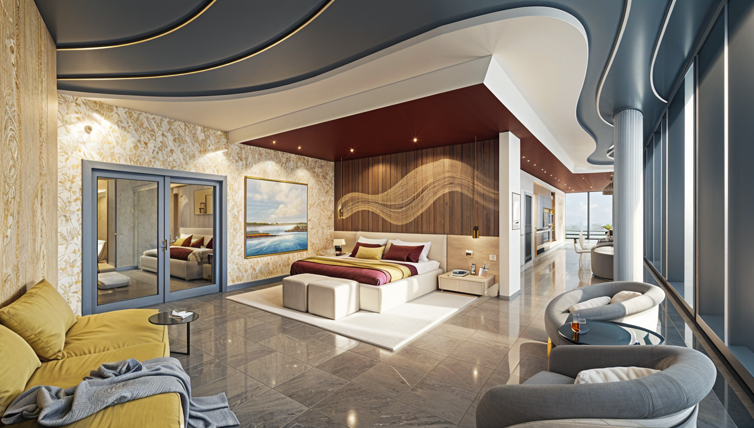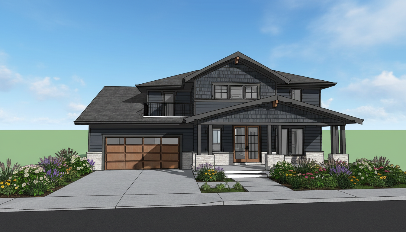 render a modern three story building with a sleek facade use matte gray panels and warm wood accents for the front incorporate large windows with a reflective sky blue tint the base should feature textured dark gray bricks add vibrant green trees at the front for contrast set in a clear sky with soft clouds creating a serene and inviting atmosphere