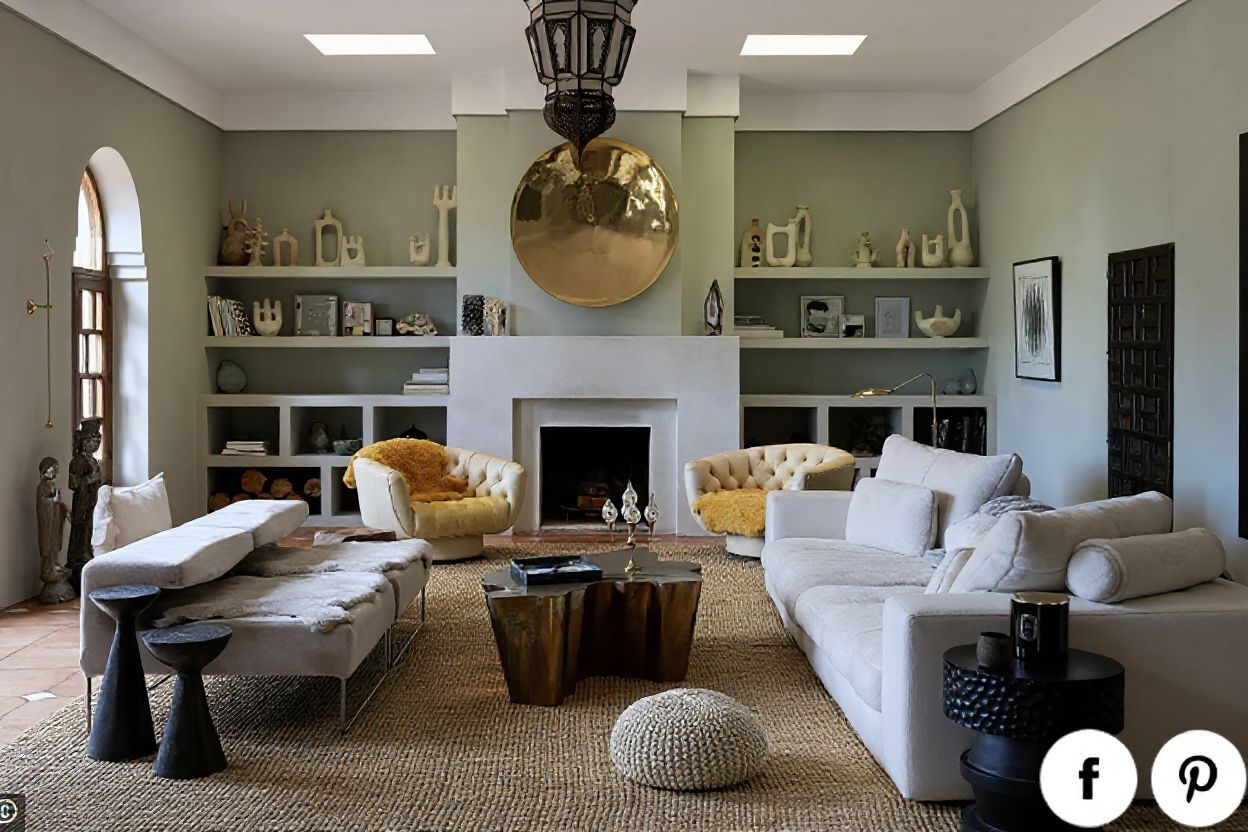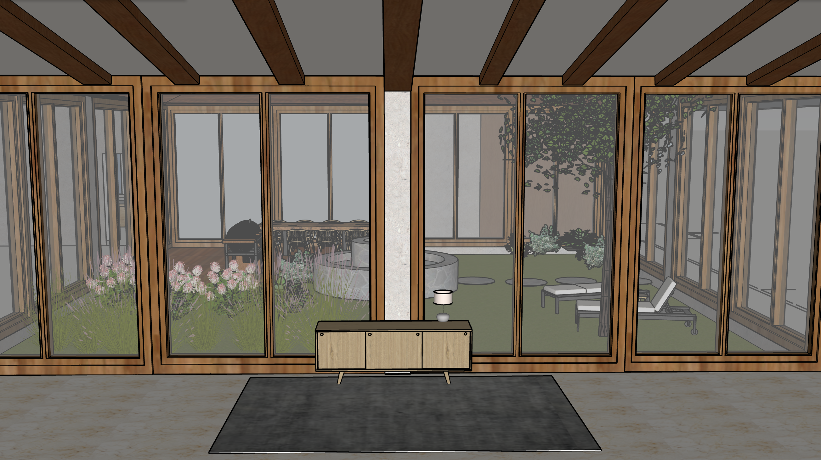 entrance of a house the floor is made of travertine the walls are limestone there is a wooden cabinet with a lamp on top floor to ceiling wooden windows from the windows you can see the patio of the house wooden beams on the ceiling a rug at the entrance