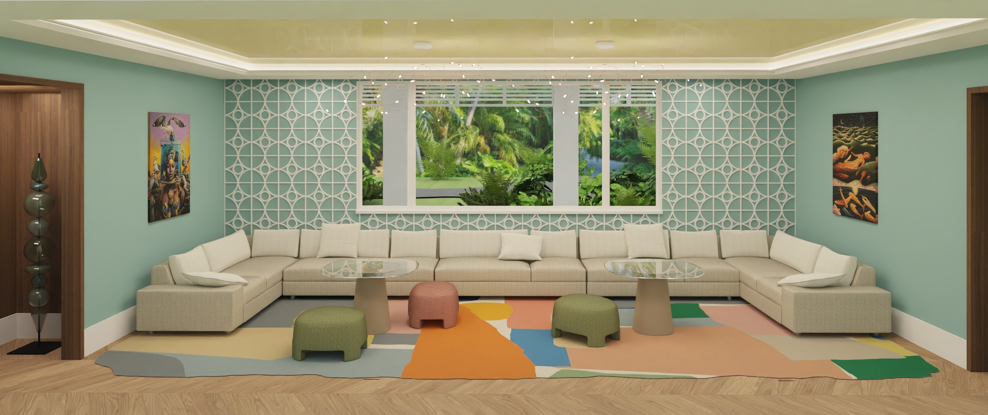 create a beautifully rendered living room scene with a modern tranquil atmosphere the walls are painted in a soft teal with a geometric pattern accent wall a large cream colored sectional sofa provides comfort with lighter cream back and throw cushions there are two contemporary glass top coffee tables the room features a colorful abstract rug with shades of orange pink blue green and beige three small ottomans two green and one pink similar to carpet add extra seating wooden herringbone flooring presents a warm natural tone the ceiling has a glowing soft yellow hue with tiny lights creating a starry effect a large window reveals lush green tropical foliage outside inviting nature into the space while modern art pieces on the walls add an artistic touch