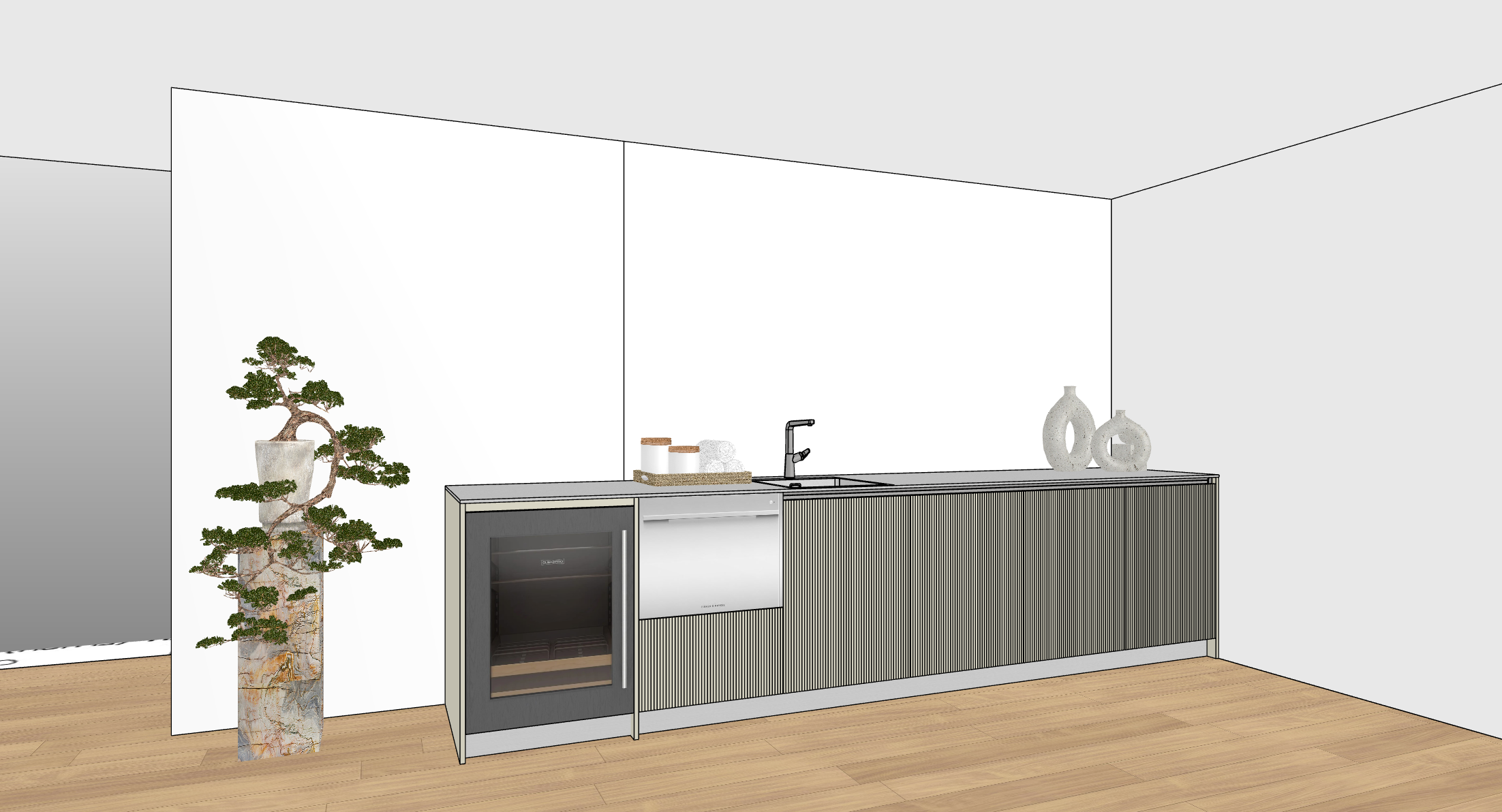 keep original finishes the countertop is stainless steel doors are fluted glossy glass champagne color