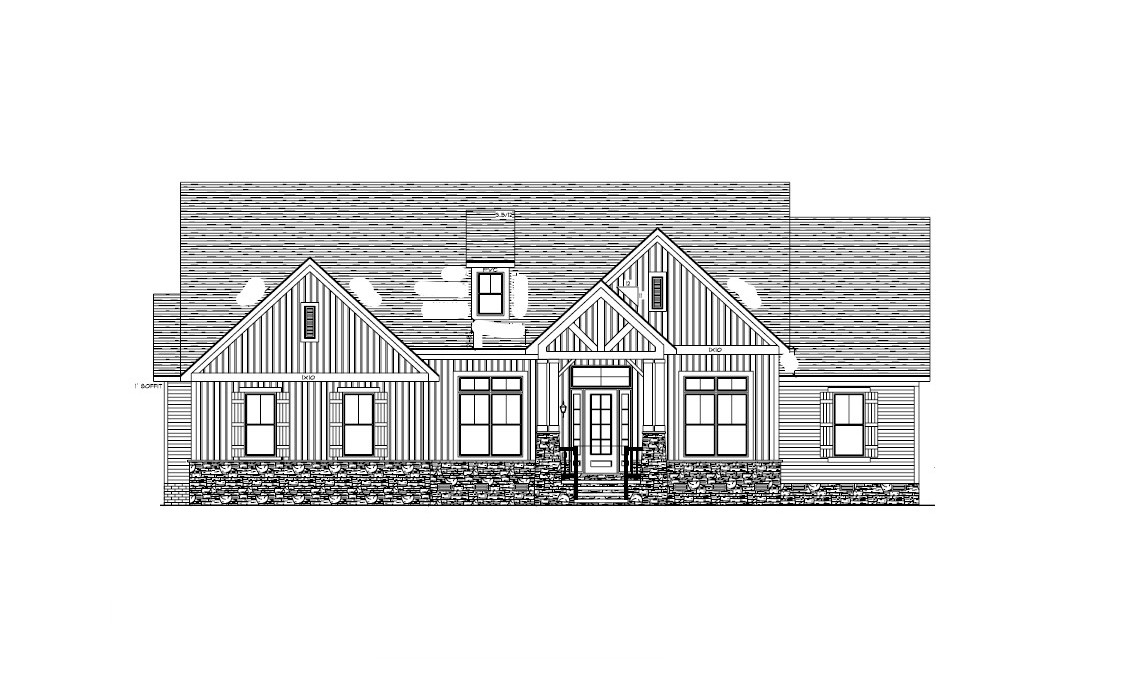 make as photorealistic as possible while keeping textures the same as selection professional landscaping in a lightly wooded scene in charlotte nc with good lighting match materials to plan and remove any text siding fafbf7 trim fafbf7 windows black roof moire black by certainteed soffits fascia white stone russet terra cut by provia front door 5c361e