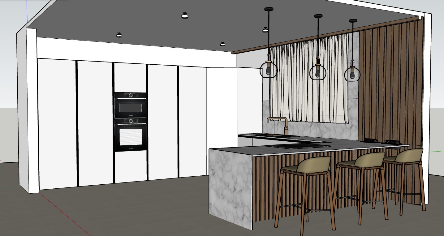 ultra realistic interior render of a modern japandi style kitchen based on the provided sketchup model maintain the exact layout proportions and design elements kitchen cabinetry in light beige off white matte finish handleless and minimal tall units wall with integrated black appliances built in oven and microwave kitchen island with waterfall edges in onyx beige marble including countertop backsplash and side panels marble should have soft warm veining with a refined natural look not overly dramatic island front finished with vertical wooden slats in a warm medium oak tone matching wood slatted feature wall behind the sink area black kitchen fixtures faucet sink and appliances three elegant pendant lights above the island with black frames and warm bulbs emitting soft ambient lighting bar stools with wooden legs and light upholstered seats in neutral beige tones back wall window covered with soft sheer curtains in off white allowing diffused natural daylight to enter lighting soft natural daylight combined with warm interior lighting creating a calm inviting atmosphere subtle shadows realistic reflections and global illumination materials highly realistic textures matte cabinetry polished marble with slight reflection natural wood grain soft fabric curtains style clean minimal warm japandi aesthetic with a luxurious but understated feel camera eye level perspective facing the island wide angle but natural not distorted render quality photorealistic high resolution sharp details realistic lighting and material accuracy